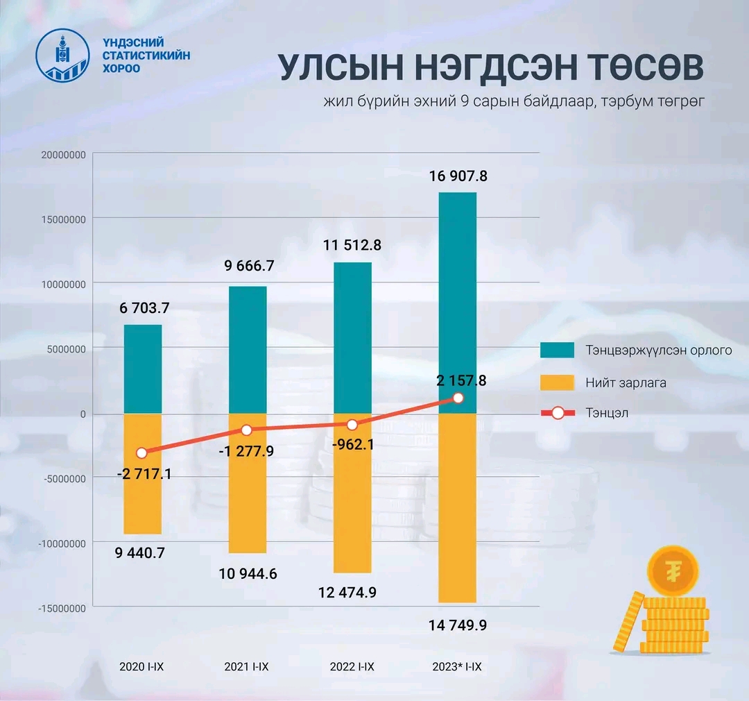 Харин тэнцвэржүүлсэн орлого 16.9 их наяд төгрөг болж, өмнөх оны мөн үеэс 5.4 их наяд төгрөг буюу 46.9 хувиар өссөн байна.