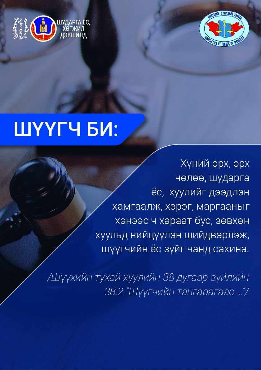 -"Авлигатай тэмцэх Үндэсний хөтөлбөр"-ийн хүрээнд хэрэгжүүлсэн Шүүгчдийн холбоо, АТГ-тай хамтын ажиллагаа: Шүүгчдийн холбоо шүүхийн нэр хүнд болон шүүгчийн хараат бусаар бие дааж шүүн таслах үйл ажиллагаа явуулахад дэмжлэг үзүүлэх, иргэд олон нийтэд шүүгчийн ажлын онцлог, бусад хуулийн байгууллагуудын ажлаас ямар ялгаатай байдаг талаар үнэн зөв, бодит мэдээ, мэдээлэл, мэдлэгийг өгөх олон талын үйл ажиллагааг сүүлийн жилүүдэд Шүүгчдийн холбооны үйл ажиллагаанд тусган хэрэгжүүлж ирлээ. 2022 онд Шүүгчдийн салбар хороогоор дамжуулж, нийт шүүгч нараасаа авлигаас ангид байх, нийгэмд бугшсан буруу зөрүү ойлголтуудыг нэг мөр залруулах, /бүх шүүгчид авлигач/ мэтээр нийгэмд түгээж буй сөрөг мэдээ мэдээллийг таслан зогсоох зорилго бүхий ажлуудыг санаачлан хийсэн юм. Үүний нэг бол Салбар хороогоор дамжуулан нийт шүүгч нараас ирүүлсэн "шүүгч", "шүүхийн ажилтан"-ууд, иргэд, олон нийтэд" хандсан АТГ-ын урьдчилан сэргийлэх, соён гэгээрүүлэх хэлтэстэй хамтарсан "Постер хийх" ажил байсан юм. Постерын ерөнхий текстийн агуулга, утга санааг шүүгчид ирүүлсэн бөгөөд УЗ-ийн гишүүд, зарим шүүгч нарын төлөөлөл оролцож боловсруулсан. Шүүгчдийн холбоо "Шүүх болон шүүгчид иргэдийн хандах хандлага" сэдэвт судалгааг 2021 онд хийлгэж, тус судалгаанд тулгуурласан ажлуудыг шүүгч нарынхаа дэмжлэг оролцоотой ажил хэрэг болгож, тодорхой үр дүн, үр нөлөөг гаргаж ирсэн. ШҮҮГЧДИЙН ХОЛБОО 1998 ОНД БАЙГУУЛАГДСАН ТҮҮХТЭЙ БОЛОВЧ ШҮҮГЧ НАРЫНХАА НЭР ХҮНД, ХАРААТ БУС БИЕ ДААСАН БАЙДЛЫГ ХАНГАХ ЧИГЛЭЛЭЭР ӨӨРӨӨР ХЭЛБЭЛ ГАДАГШАА ИРГЭД, ОЛОН НИЙТ РҮҮ ЧИГЛҮҮЛСЭН ДОРВИТОЙ АЖЛЫГ БАРАГ 2020 ОНЫГ ХҮРТЭЛ ХИЙЖ БАЙГААГҮЙ ЮМ БАЙНА ЛЭЭ. Сүүлийн жилүүдэд "ШҮҮХ БАЙГУУЛЛАГА, ШҮҮГЧ НАРЫН НЭР ТӨР, ХАРААТ БУС, БИЕ ДААСАН БАЙДАЛ"-ыг хангах зорилгоор, мөн ШҮҮГЧДИЙН ХОЛБООНЫ үйл ажиллагааг бэхжүүлэх, нийгэмд таниулах, холбоогоороо дамжуулж, Дээд шатны шүүх, ШЕЗ, ШСХ болон бусад ижил төстэй дотоод, гадаад байгууллагатай харьцаж, хамтран ажиллаж, үйл ажиллагаагаа тэлж, нийгэмд танигдах ажлуудыг дэс дараатай өргөн хүрээтэй хийхийг зорьж ажилласан байна. Бүх шатны шүүгчдээ нэгтгэсэн "Шүүгчдийн холбоо"-г бэхжүүлэх, тус холбооны үйл ажиллагаагаар уламжлан шүүх байгууллага, шүүгчдийн нэр хүндийг өсгөх олон талын бодит ажлуудыг ШЕЗ, бүх шатны шүүхийн Тамгын газар, ижил төрлийн үйл ажиллагаа явуулдаг ТББ-ууд, хэвлэл мэдээллийн байгууллагуудтай хамтын үйл ажиллагаагаа өргөжүүлснээр өөрсдийгөө таниулах, ойлгуулах, хараат бус байдлаа хадгалах, хамгаалахад олон талын ач холбогдолтой гэдэг нь сүүлийн жилүүдэд хийж хэрэгжүүлсэн холбооны ажлуудын үр дүнгээр харагдаж байгааг хэлье. БҮХ ШҮҮГЧ /авлигач гэх/ АВИЛГАЛД АВТСАН МЭТ ӨРӨӨСГӨЛ ОЙЛГОЛТООС АНГИЖИРЦГААЯ.
