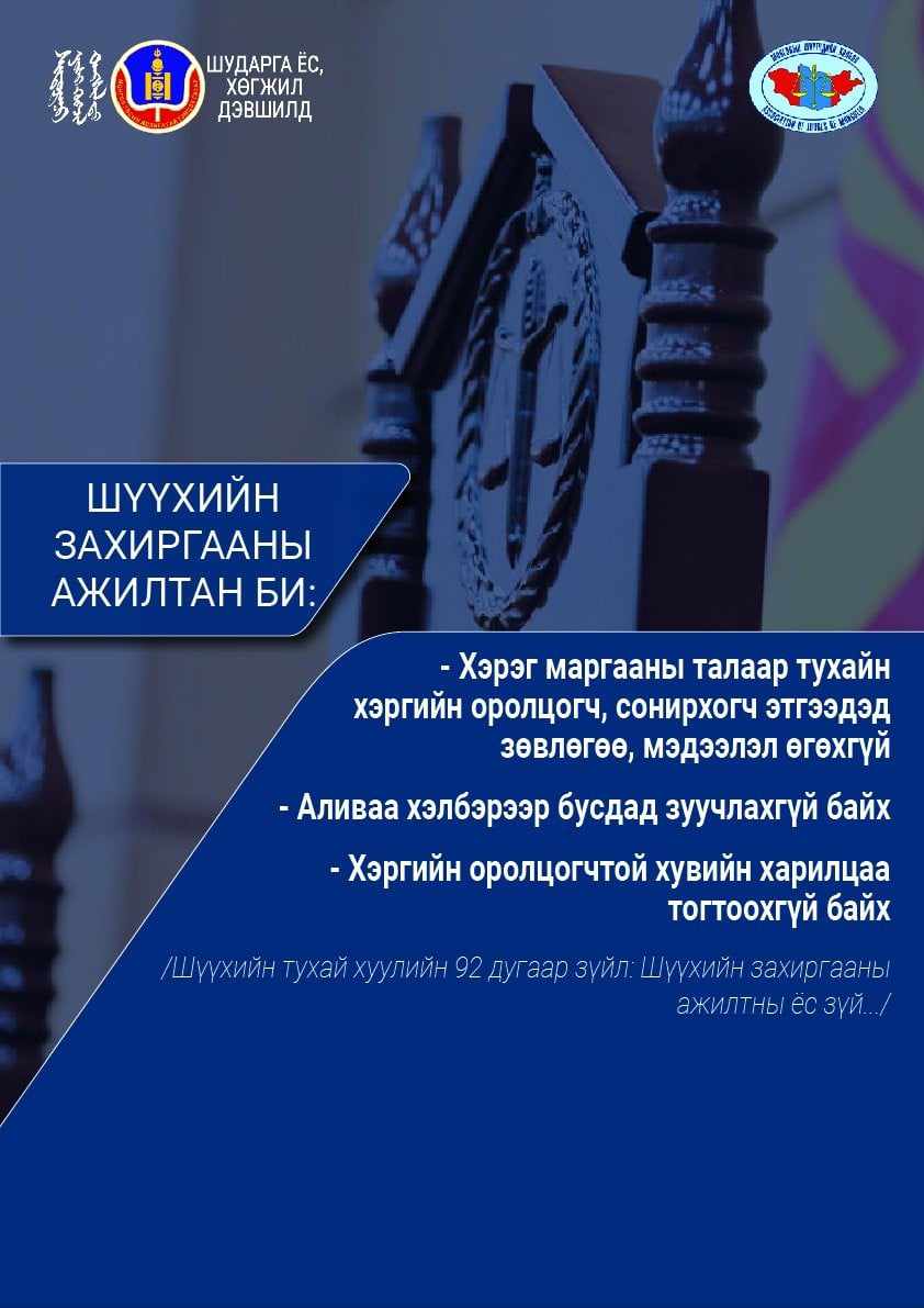 М.МӨНХМАНДАХ: ШҮҮХИЙН СЭТГҮҮЛ ЗҮЙГ ХӨГЖҮҮЛЭХ НЬ ИРГЭДЭД ҮНЭН БОДИТ МЭДЭЭЛЭЛ ХҮРГЭХЭЭС ГАДНА ШҮҮХ ТОГТОЛЦООНД ИТГЭХ ҮНЭМШЛИЙГ БИЙ БОЛГОНО