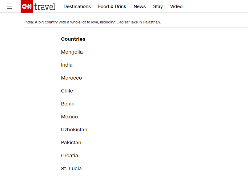 “Аялал жуулчлалын шилдэг орнууд” жагсаалтад баруун Африк, Энэтхэг, Марокко, Чили, Бенин, Мексик, Узбекистан, Пакистан, Хорват, Карибын тэнгисийн зүүн хэсэгт орших Сент Люсиа зэрэг орнууд багтжээ.