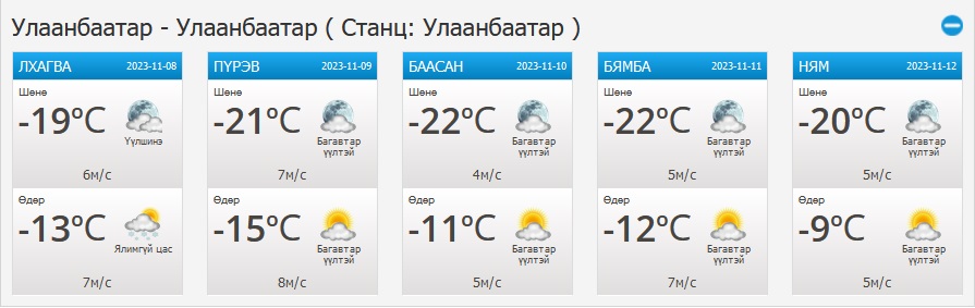 УЛААНБААТАР ХОТ ОРЧМООР: Үүлшинэ. Шөнөдөө цас орохгүй, өдөртөө ялимгүй цас орно. Салхи баруун хойноос секундэд 4-9 метр. Шөнөдөө Яармаг-Сонгины орчмоор -23...-25 градус, бусад хэсгээр -18...-20 градус, өдөртөө -12…-14 градус хүйтэн байна.
