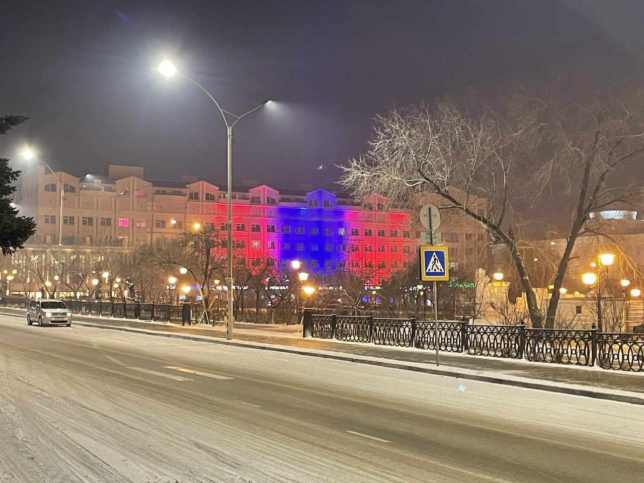 Өвөр байгалийн хязгаарын “Забайкалье” зочид буудлыг өчигдөр орой Монголын төрийн далбааны өнгөөр гэрэлтүүлжээ.