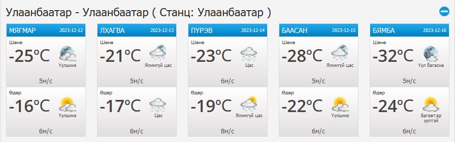 УЛААНБААТАР ХОТ ОРЧМООР: Үүлшинэ. Цас орохгүй. Салхи зүүн өмнөөс секундэд 4-9 метр. Шөнөдөө Яармаг-Сонгины орчмоор -30...-32 градус, бусад хэсгээр -24...-26 градус, өдөртөө -15...-17 градус хүйтэн байна.