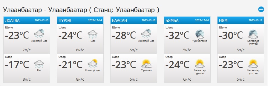 УЛААНБААТАР ХОТ ОРЧМООР: Үүлшинэ. Шөнөдөө ялимгүй цас, өдөртөө цас орно. Салхи зүүн өмнөөс баруун хойш эргэж секундэд 5-10 метр. Шөнөдөө Яармаг-Сонгины орчмоор -29...-31 градус, бусад хэсгээр -22...-24 градус, өдөртөө -16...-18 градус хүйтэн байна.