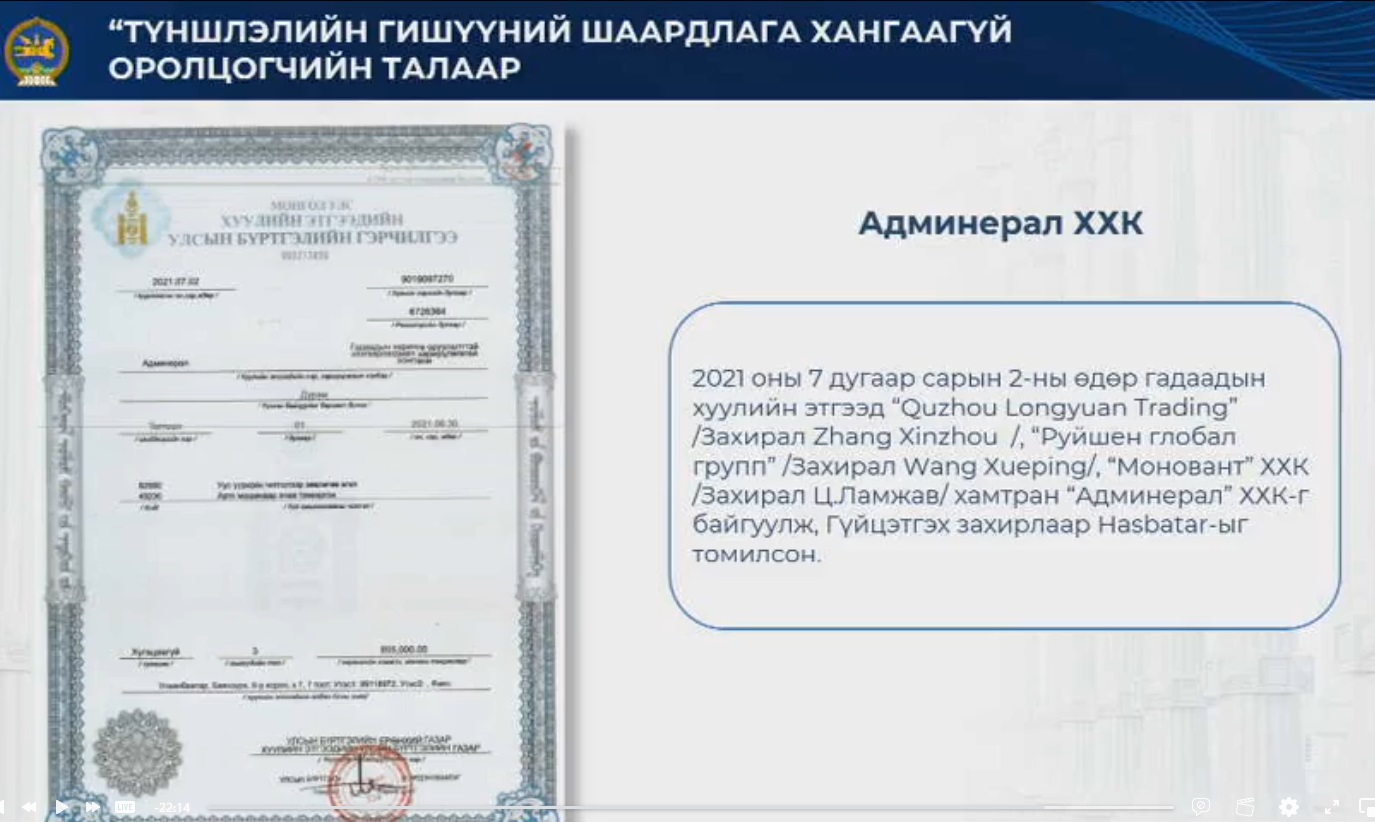 Тэгэхэд нэлээд судалгаа хийсэн, тодорхой хэмжээнд бэлдсэн нь “Админерал” ХХК байна гэж бид ойлгож, миний бие тус “Админерал” ХХК-ийн захирал Ламжавтай уулзаж байсан." гэлээ.