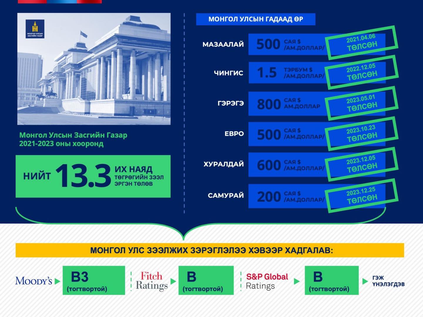 ЗАСГИЙН ГАЗАР НИЙТДЭЭ 4.1 ТЭРБУМ АМ.ДОЛЛАРЫН БОНДЫГ ТӨЛЖ, 12 ЖИЛИЙН ХУГАЦААНД 13.3 ИХ НАЯД ТӨГРӨГ ЗАРЦУУЛЖЭЭ