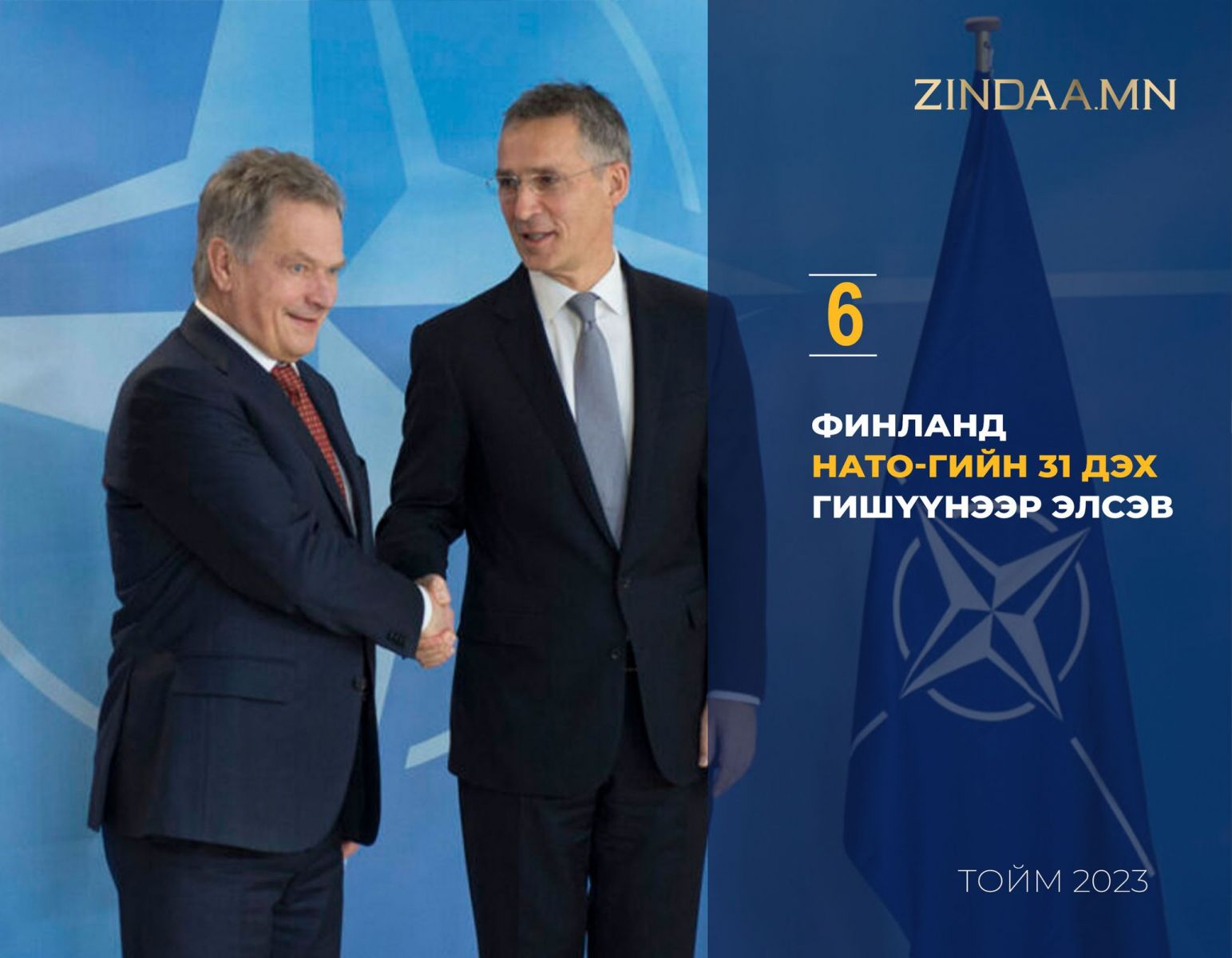 Дөрөвдүгээр сарын 4-нд Финланд НАТО-гийн 31 дэх бүрэн эрхэт гишүүнээр элсэв. Улмаар НАТО, Оросын хил хоёр дахин уртсаж, 2600 км-т хүрч байна. ОХУ Украин руу халдан довтолсны дараа буюу 2022 оны тавдугаар сард Финланд нь цэргийн эвсэлд үл нэгдэх бодлогоосоо татгалзаж, Шведийн хамтаар НАТО-д элсэх өргөдөл өгсөн билээ.