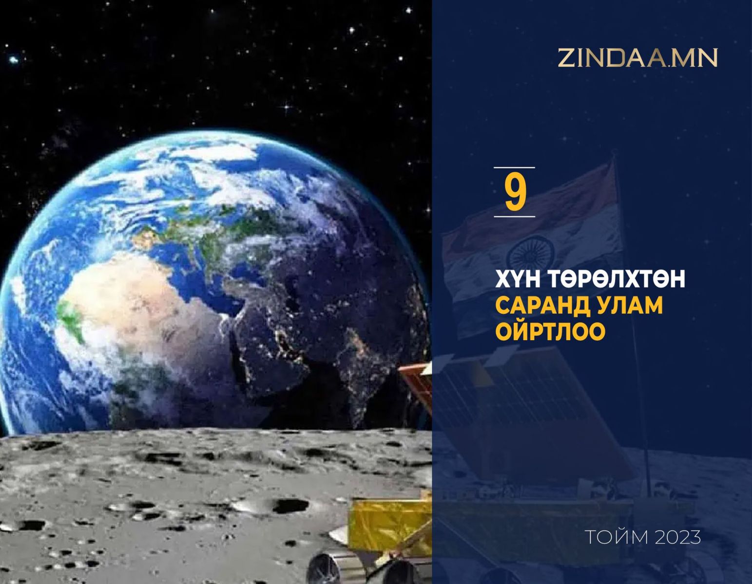 Наймдугаар сарын сүүлээр Энэтхэг улс “Chandrayaan‑3” хөлгөө дэлхий дагуул дээр амжилттай буулгав. Ингэснээр Энэтхэг улс сарны өмнөд туйлд сансрын аппаратаа амжилттай газардуулсан анхны улс, саран дээр буусан дөрөв дэх улс болж байна. Хэдийгээр “Chandrayaan‑3” сарны хүйтэн шөнийг давж гарч чадаагүй ч олон чухал мэдээлэл цуглуулж, даалгавраа амжилттай биелүүлсэн билээ.