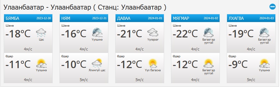 Малчид, иргэд, тээвэрчдийн анхааралд: Өнөө шөнө нутгийн зүүн хэсгээр, маргааш өдөр Дорнод-Монголын тал нутгаар цас орж, цасан шуурга шуурахыг анхааруулж байна. 2023 оны 12 дугаар сарын 30-ны 20 цаг хүртэлх цаг агаарын урьдчилсан мэдээ Хур тунадас: Ихэнх нутгаар үүлэрхэг. Шөнөдөө төвийн болон говийн аймгуудын нутгийн зарим газар, зүүн аймгуудын нутгийн өмнөд хэсгээр, өдөртөө баруун аймгуудын нутгийн хойд, төвийн аймгуудын нутгийн баруун хойд хэсэг, зүүн аймгуудын нутгийн зүүн хэсгээр цас орж, цасан шуурга шуурна. Салхи: Шөнөдөө нутгийн баруун хэсгээр баруун өмнөөс, бусад нутгаар баруун хойноос секундэд 5-10 метр, өдөртөө ихэнх нутгаар баруун өмнөөс секундэд 5-10 метр, Алтайн салбар уулс болон говь, талын нутгаар секундэд 12-14 метр хүрч ширүүснэ. Агаарын температур: Шөнөдөө Увс нуур болон Дархадын хотгор, Завхан голын эх, Идэр, Тэс, Эг, Үүр, Байдраг голын хөндийгөөр -30...-35 градус, Хангай, Хөвсгөлийн уулархаг нутаг, Орхон, Хараа, Ерөө голын хөндийгөөр -25...-30 градус, Алтайн уулархаг нутаг, Их нууруудын хотгор, Туул, Тэрэлж голын хөндийгөөр -20...-25 градус, Хангайн нурууны өвөр бэл орчмоор -10...-15 градус, говийн бүс нутгийн баруун өмнөд хэсгээр -5...-10 градус, бусад нутгаар -15...-20 градус, өдөртөө Увс нуур болон Дархадын хотгор, Завхан голын эх, Тэс, Эг, Үүр голын хөндийгөөр -18...-23 градус, Хөвсгөлийн уулархаг нутаг, Хүрэнбэлчир орчим, Идэр, Байдраг, Орхон, Сэлэнгэ, Хараа, Ерөө, Тэрэлж, Хэрлэн голын хөндийгөөр -12...-17 градус, Их нууруудын хотгор, Хангайн нурууны өвөр бэл болон говийн бүс нутгийн өмнөд хэсгээр -1...-6 градус, бусад нутгаар -7...-12 градус хүйтэн байна. УЛААНБААТАР ХОТ ОРЧМООР: Үүлшинэ. Шөнөдөө цас орно. Өдөртөө цас орохгүй. Салхи шөнөдөө баруун хойноос, өдөртөө баруун өмнөөс секундэд 5-10 метр. Шөнөдөө Яармаг-Сонгины орчмоор -21...-23 градус, бусад хэсгээр -17...-19 градус, өдөртөө -10...-12 градус хүйтэн байна. БАГАНУУР ОРЧМООР: Үүлшинэ. Шөнөдөө ялимгүй цас орно. Өдөртөө цас орохгүй. Салхи шөнөдөө баруун хойноос, өдөртөө баруун өмнөөс секундэд 5-10 метр. Шөнөдөө -17...-19 градус, өдөртөө -10...-12 градус хүйтэн байна. ТЭРЭЛЖ ОРЧМООР: Үүлшинэ. Шөнөдөө цас орно. Өдөртөө цас орохгүй. Салхи шөнөдөө баруун хойноос, өдөртөө баруун өмнөөс секундэд 5-10 метр. Шөнөдөө -21...-23 градус, өдөртөө -12...-14 градус хүйтэн байна.