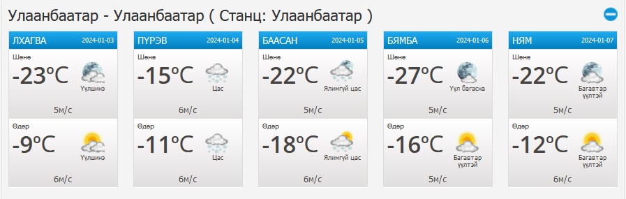 УЛААНБААТАР ХОТ ОРЧМООР: Багавтар үүлтэй. Цас орохгүй. Салхи баруун хойноос секундэд 4-9 метр. Шөнөдөө Яармаг-Сонгины орчмоор -29...-31 градус, бусад хэсгээр -21...-23 градус, өдөртөө -12...-14 градус хүйтэн байна.