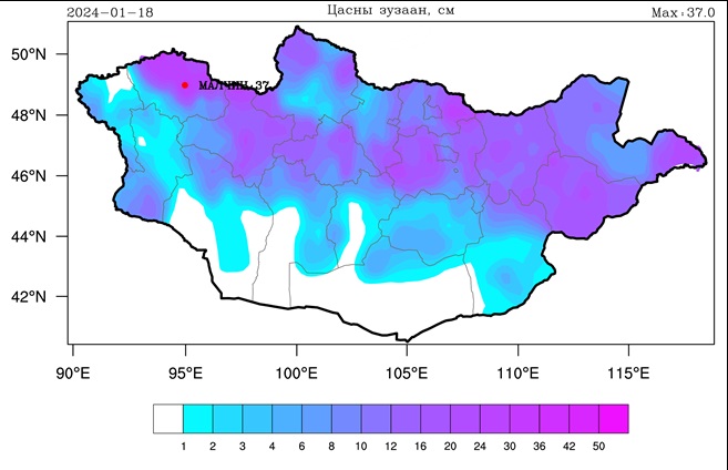 Үүнээс хамгийн их нь Увсын Малчинд 37.0 см, Сагилд 32.0 см, Баруунтуруун, Давст, Хяргаст 30.0 см, Увсын Улаангом, Сэлэнгийн Бугантад 29.0 см, Зүүнговь, Завханы Баянтэс, Төв аймгийн Эрдэнэсантад 26.0-28.0 см, бусад хэсгээр 0.0-25.0 см цасан бүрхүүл тогтжээ.