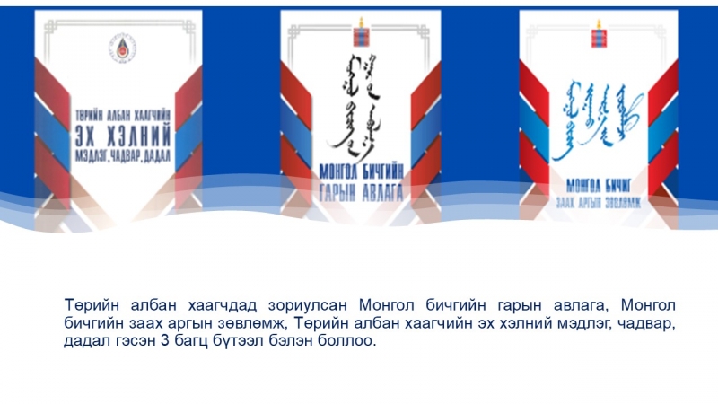 Төрийн албан хаагчдад зориулсан Монгол бичгийн гарын авлага, Монгол бичгийн заах аргын зөвлөмж, Төрийн албан хаагчийн эх хэлний мэдлэг, чадвар, дадал гэсэн 3 багц бүтээл бэлэн боллоо.