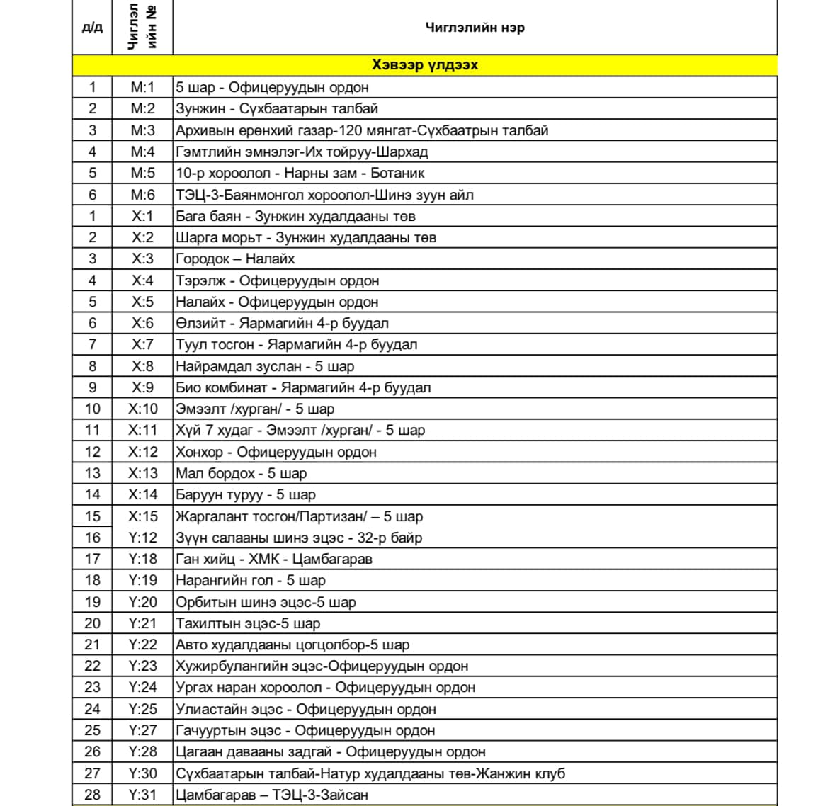 Тодруулбал, нийтийн тээврийн өмнө нь үйлчилж байсан 110 чиглэлээс 71 чиглэлийг, шинэ төлөвлөлтийн 74 чиглэлээс 34 чиглэлийг хэвээр үлдээж байгаа юм. Тус төлөвлөлт нь өнөөдрөөс буюу нэгдүгээр сарын 22-ноос үйлчилнэ.