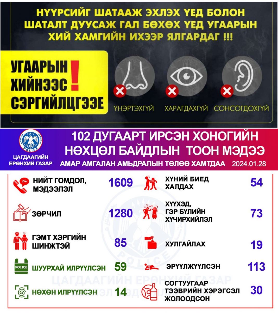 Цагдаагийн байгууллагын 102 тусгай дугаарт 2024 оны нэгдүгээр сарын 28-ны өдөр нийт 1609 дуудлага, мэдээлэл бүртгэгджээ.