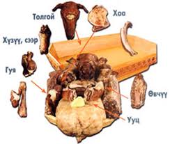Бага бүхэлд хүзүү сээр толгойг төлөөлж дал дөрвөн өндөр хавирга гуяыг төлөөлүүлж хонхт, шаант чөмөг, дотор эрхтэнг төлөөлүүлж гургалдайг тавина. Шүүс тавихдаа мал зочин руу хараад дөрвөн хөлөө нугалан хэвтэж буй мэтээр эрэмбэлэн тавина.