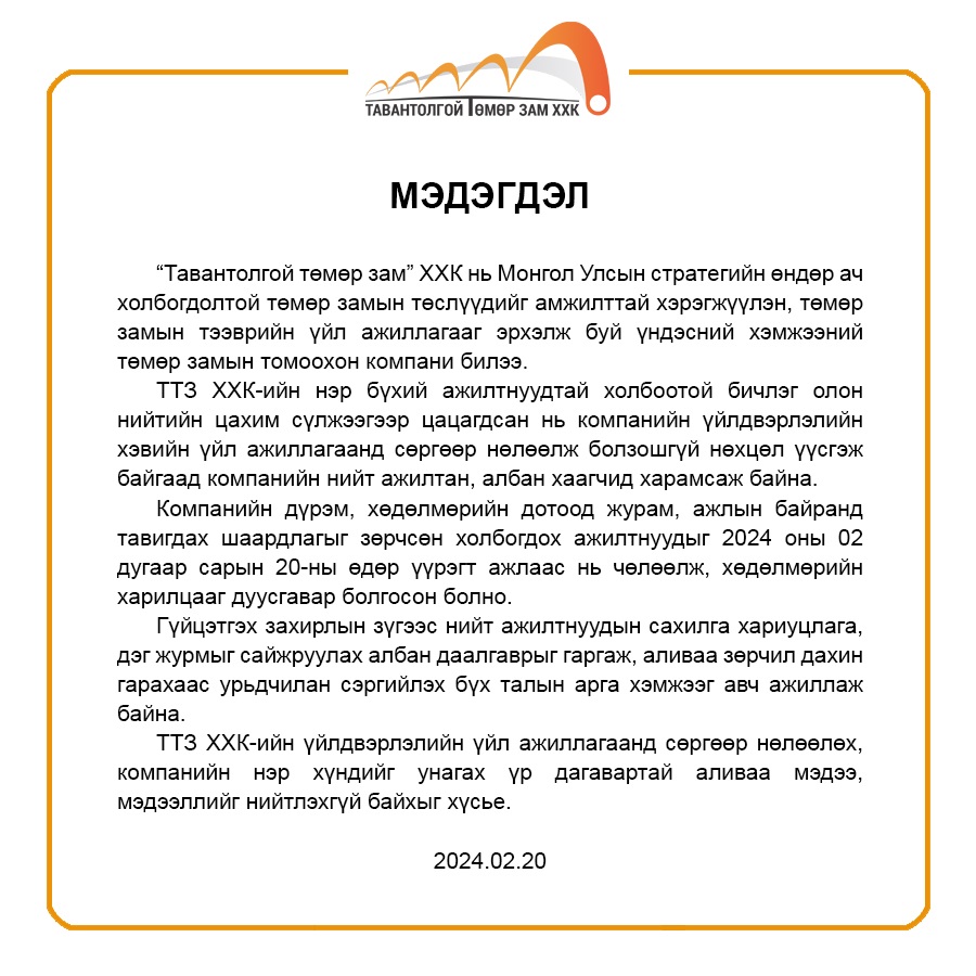 Тус компанийн зүгээс компанийн дүрэм, хөдөлмөрийн дотоод журам, ажлын байранд тавигдах шаардлагыг зөрчсөн гэж үзэн тухайн ажилтнуудыг өнөөдрөөс /2024.02.20/ үүрэгт ажлаас нь чөлөөлж, хөдөлмөрийн харилцааг дуусгавар болгосноо мэдэгдлээ.