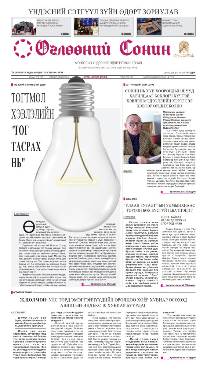 Жирийн л нэг сонин. Хэн нэг нь шимтэн уншдаг, зарим нь онцгойлсон сэдвээ бүр зорьж олж хайчилж аваад хадгалдаг, нөгөө нь гарчиглаад таарсан зүг рүүгээ шиддэг, хайхрамжгүй нэг нь гүйлгэж харсан болоод хогийн сав руу хумхиад чулууддаг. Эсвэл гал ноцооно, юм хум арчина, арга ядсан үед тамхи ороож ч болно. Дэлгэцэд хэт автсан зарим нь цаасан хэвлэл гэж юу байдгийг мэдэх ч үгүй, мэдэхийг ч хүсэхгүй. Сошиал хөгжсөн өнөө үед цаасан дээр хэвлэсэн сонин гэдэг зүйл ер нь ямар хэрэгтэй юм бол оо. Тэр мэдээг олон нийтийн сүлжээн дээрээс минут секунд алдалгүй дор нь мэдээд авчихна шүү дээ. Бүр тал бүрийн олон өнцгөөс гээч. Телевизээр харчихна, сайтаас үзчихнэ. Далбагар цаас дэлгэж, өчигдөр болсон үйл явдлыг өнөөдөр харж суух ямар хэрэгтэй гэж. Цаас будаг үрж, үйлдвэрт өрж хэвлэж, унаа машинаар зөөж, шуудан холбоонд хүргэж, онгоц, машин, галт тэргэнд хугацаанд нь дайж явуулахаар тэвдэж, зах хязгаар нутагт долоо, арав хоногийн дараа хүрдэг “балар эртний” гэмээр сонин гэгч цоохор цаас хэрэглээнээс шахагдах дээрээ тулсан биш гэж үү.