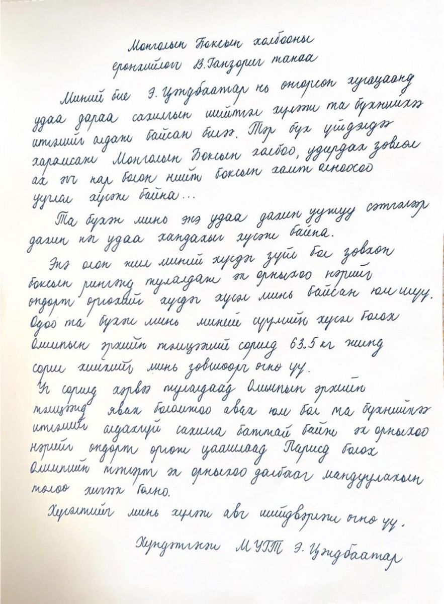 Тэрбээр өөрийн цахим хуудаснаа энэ тухай хүсэлт бичсэн өргөдлөө нийтэлж, "Миний бие өнгөрсөн хугацаанд удаа дараа сахилгын шийтгэл хүлээж, та бүхнийхээ итгэлийг алдаж байсан билээ. Тэр бүх үйлдэлдээ харамсаж, Монголын боксын холбоо, Удирдах зөвлөл, боксын хамт олноосоо уучлал хүсэж байна. Миний сүүлийн хүсэл болох Парисын олимпын эрх олгох тэмцээний 63.5 кг жинд сорил хийхийг минь зөвшөөрч өгнө үү. Парисын олимпын тэнгэрт эх орныхоо далбааг мандуулахын төлөө хичээх болно" гэхчлэн байр сууриа олон нийтэд нээлттэй илэрхийлээд байна.
