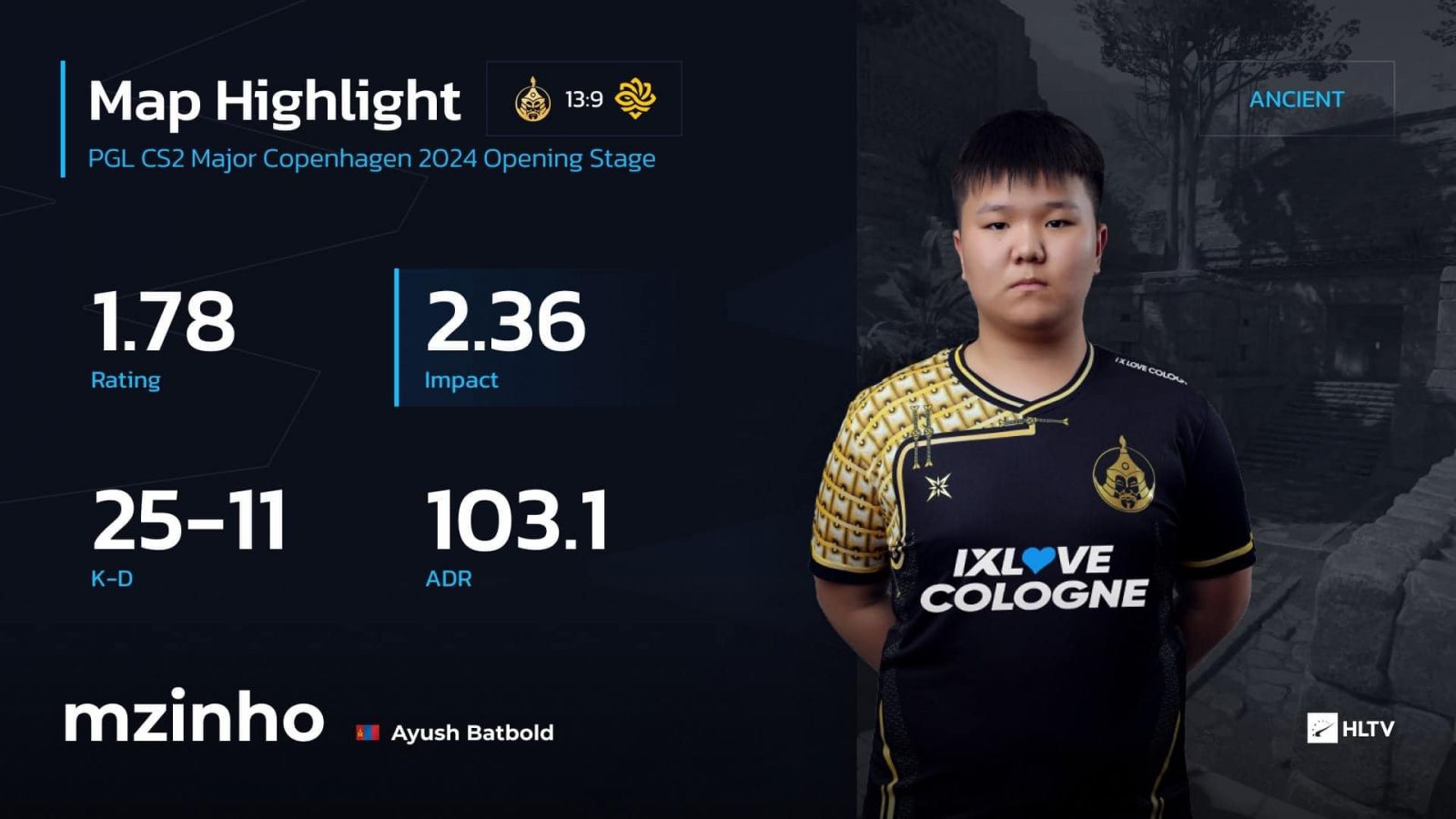 Тус тоглолтод Дэлхийн аваргад оролцож буй хамгийн залуу тоглогч, "The Mongolz"-ын 16 настай "Mzinho" буюу Б.Аюуш 36-24 K-D болон 87.8 ADR-тайгаар багаа тэргүүлжээ.