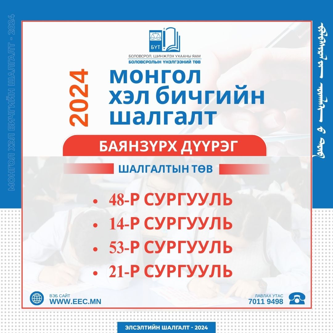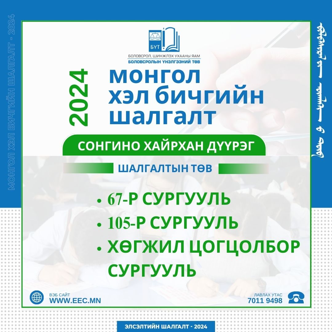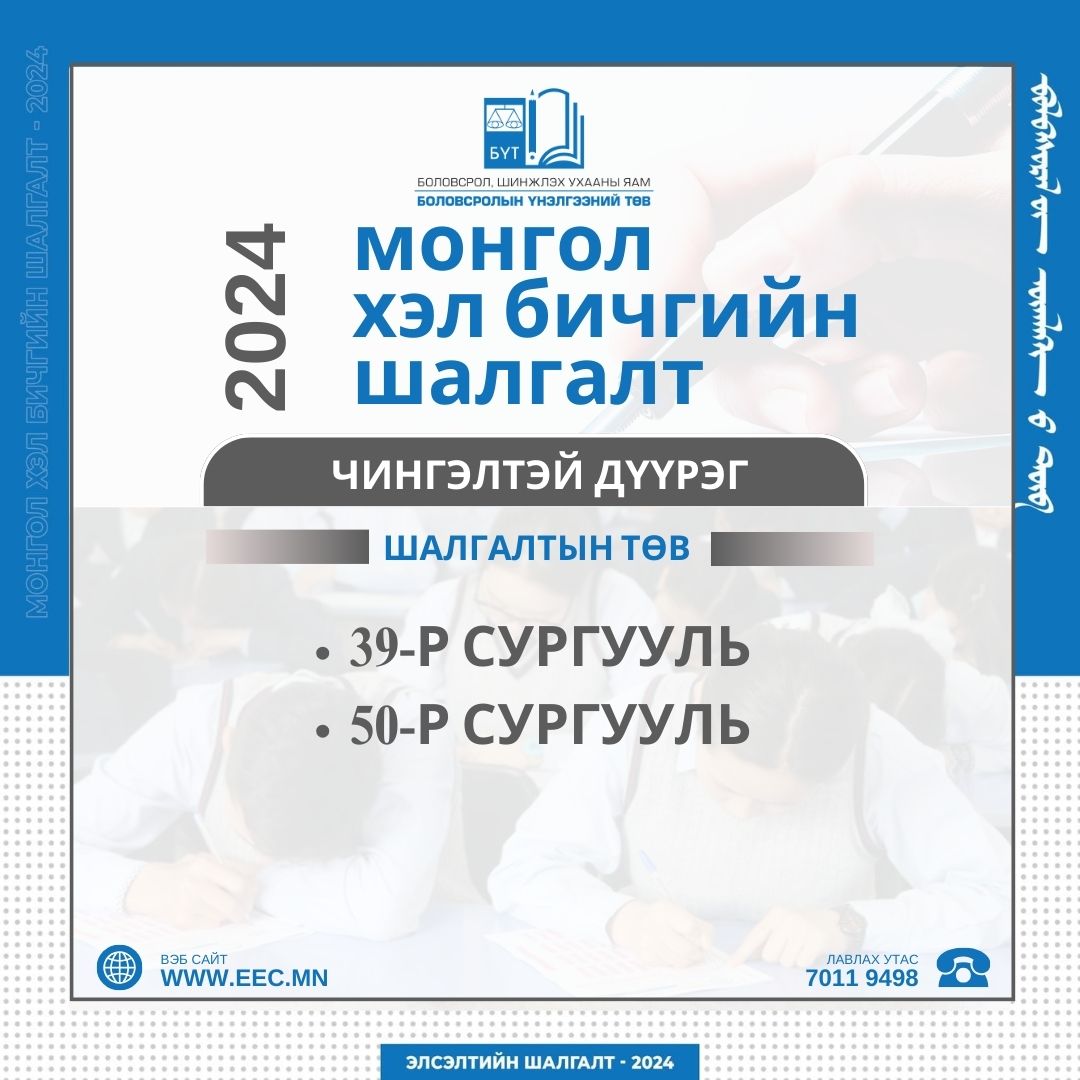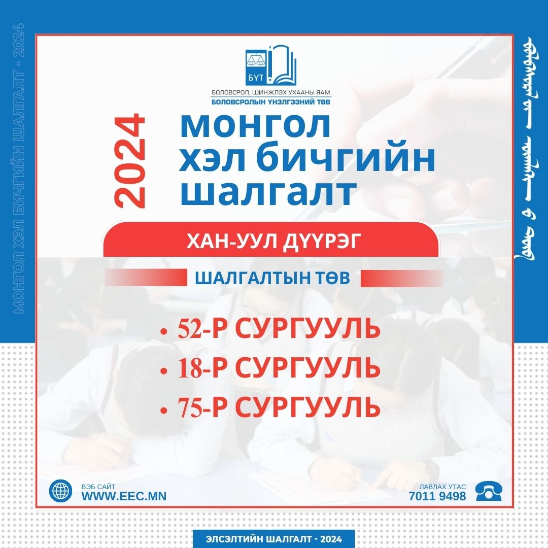 Монгол хэл бичгийн шалгалт 2024 оны 04 дүгээр сарын 06-ны өдөр 10:00-11:40 цагт зохион байгуулагдах юм.