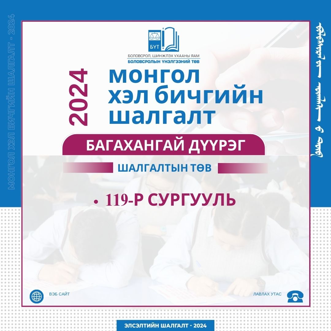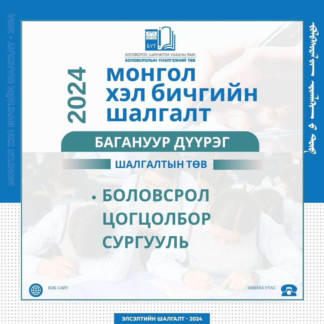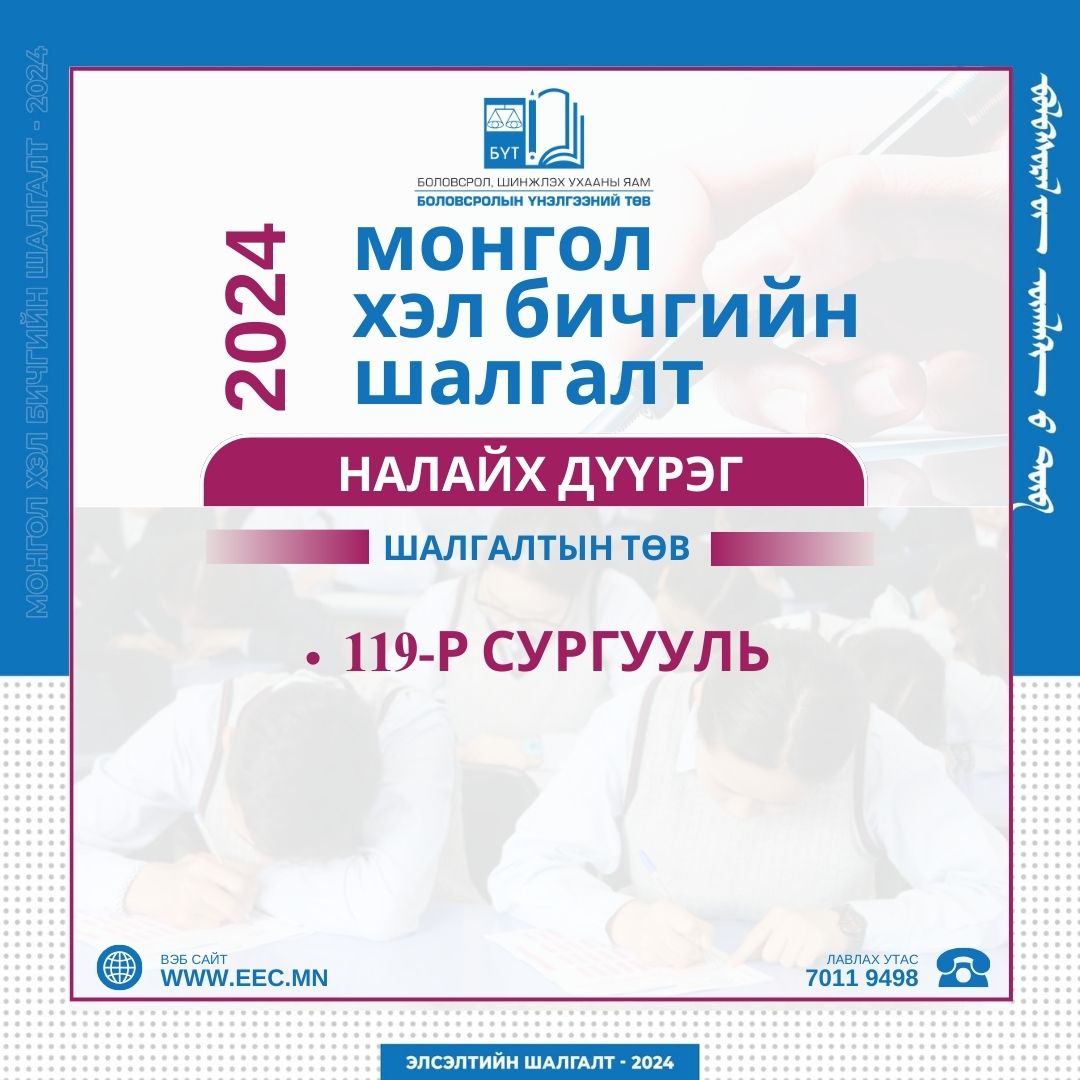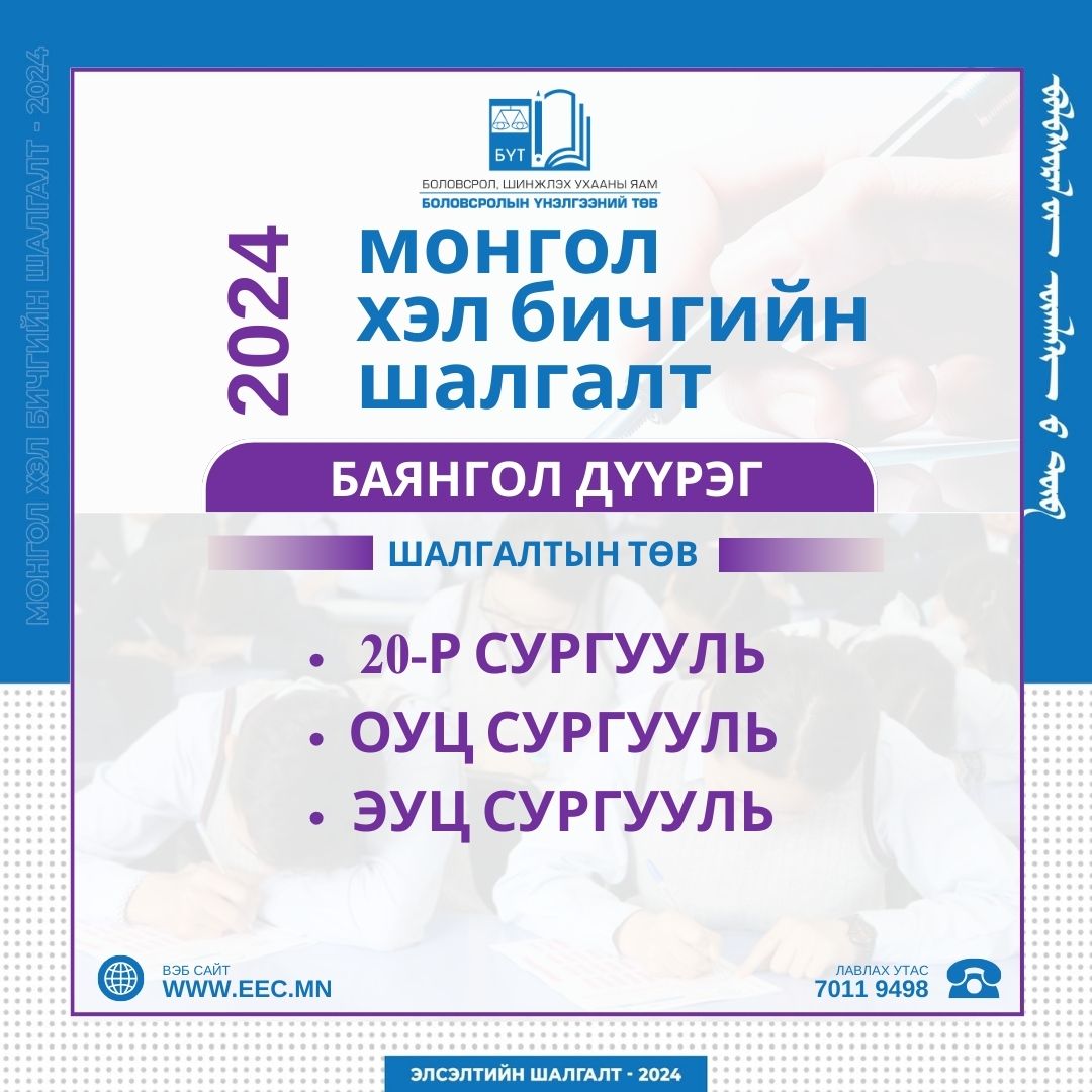 Монгол хэл бичгийн шалгалт 2024 оны 04 дүгээр сарын 06-ны өдөр 10:00-11:40 цагт зохион байгуулагдах юм.