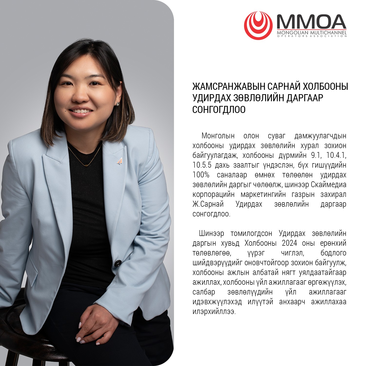 Монголын олон суваг дамжуулагчдын холбооны удирдах зөвлөлийн хурал зохион байгуулагдаж, холбооны дүрмийн 9.1, 10.4.1, 10.5.5 дахь заалтыг үндэслэн, бүх гишүүдийн 100% саналаар өмнөх төлөөлөн удирдах зөвлөлийн даргыг чөлөөлж, шинээр Скаймедиа корпорацийн маркетингийн газрын захирал Ж.Сарнай Удирдах зөвлөлийн даргаар сонгогдлоо.