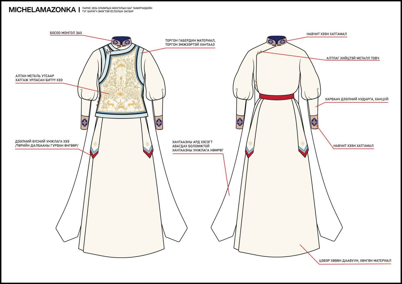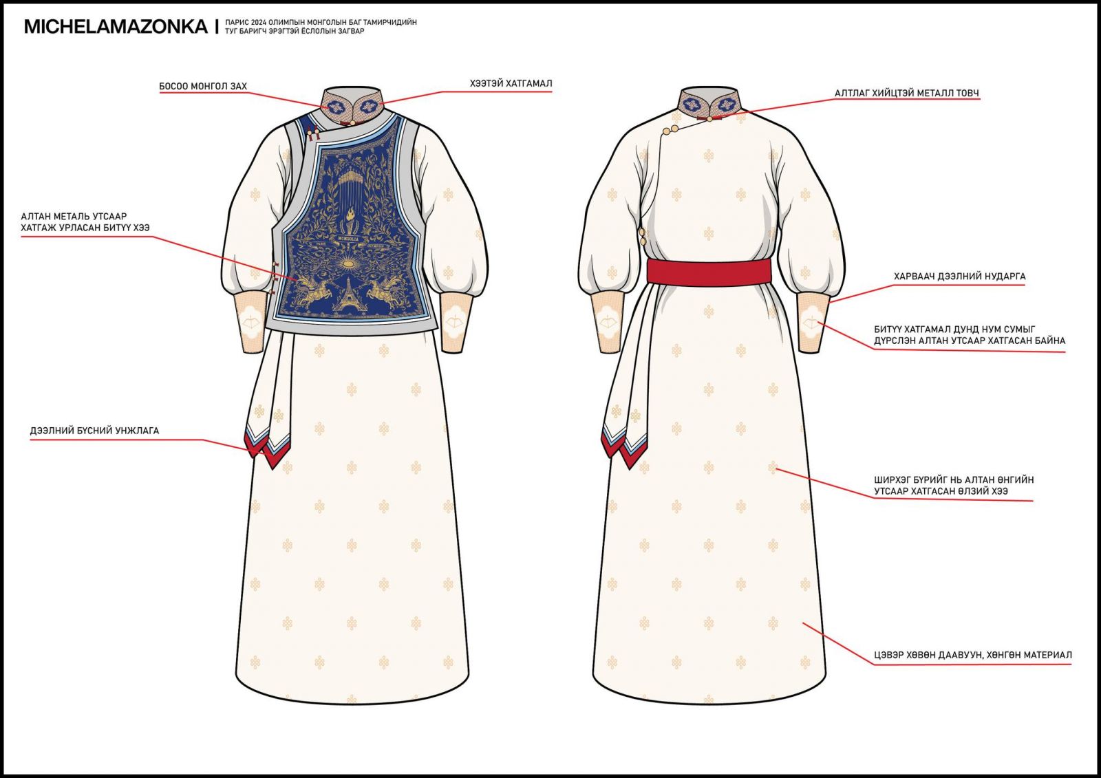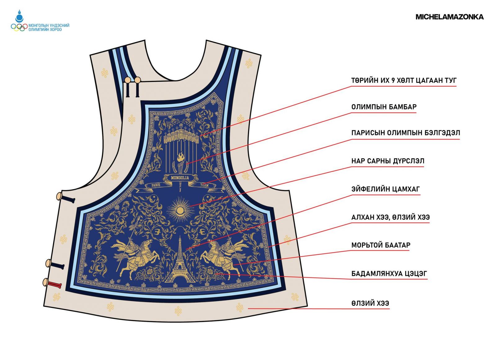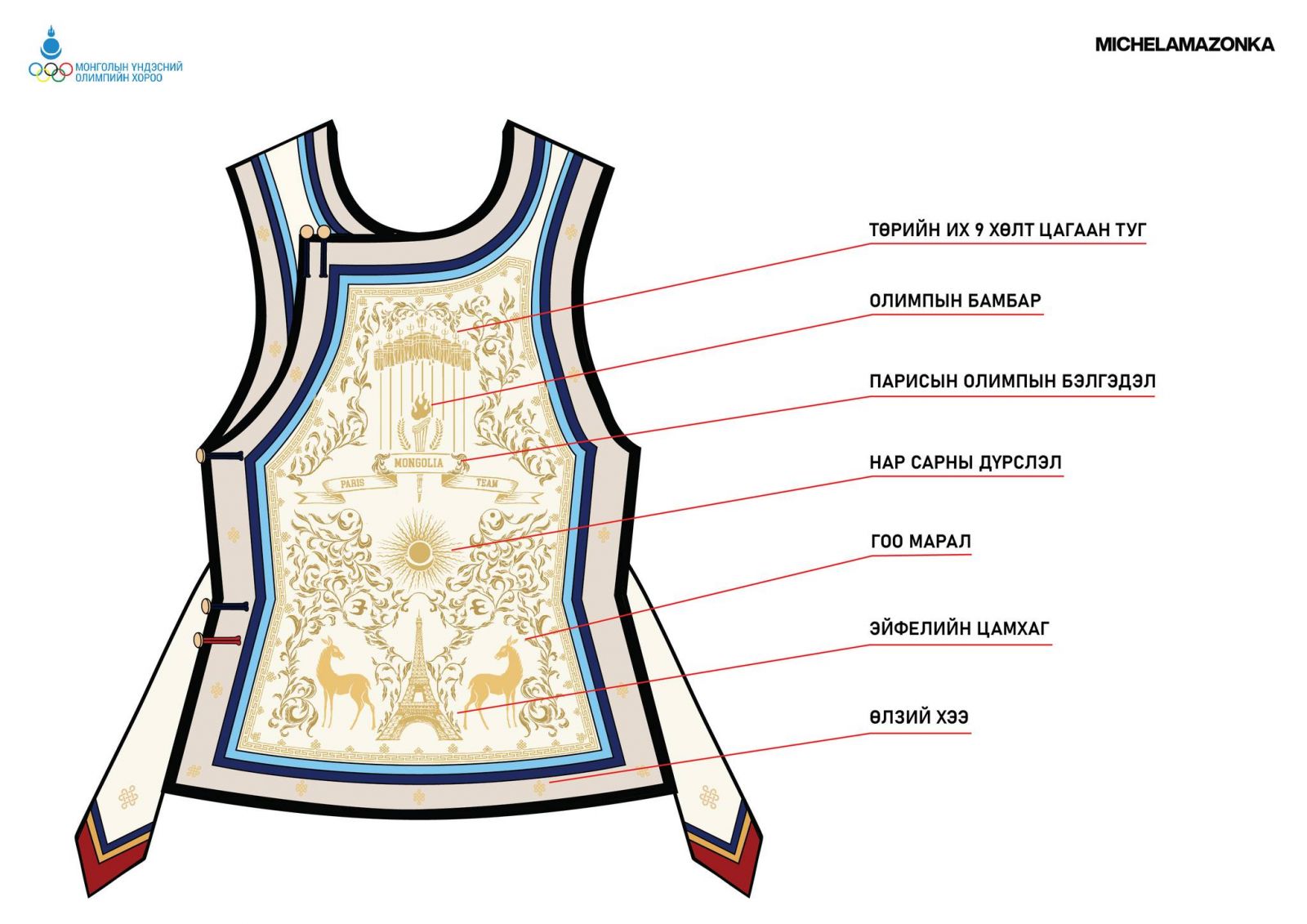 “Парис 2024” Олимпын наадамд оролцох Монголын баг тамирчдын хувцасны үйлдвэрлэгч болон загварыг сонгон шалгаруулахаар 18-60 насны 9,222 иргэн, Үндэсний шигшээ багийн 303 хүний дунд санал асуулга явуулж, 17 брэндийг нэрлэсэн байна. Үүний хүрээнд МҮОХ-ноос хамгийн өндөр санал авсан 10 байгууллагатай хамтран ажиллах үйл ажиллагаа өрнүүлж, “Michel & Amazonka” брэнд баг тамирчдын ёслолын хувцсыг, “Mizuno” брэнд спортын хувцсыг урлахаар шийдвэрлэв.