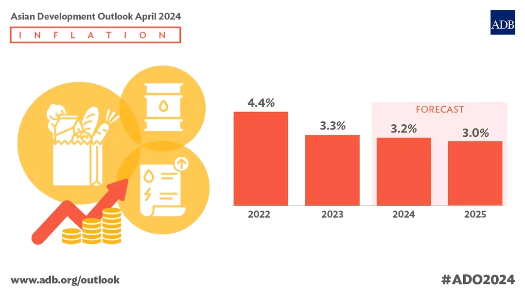 Азийн хөгжлийн банк /АХБ/-наас танилцуулсан 2024 оны дөрөвдүгээр сарын Азийн хөгжлийн төлөв (АХТ) тайланд тус тив эдийн засгийн өсөлтөө ирэх онд хадгална хэмээн тооцоолжээ. Олон улс оронд хүнсний бүтээгдэхүүний үнэ өссөнөөс үүдэн инфляцын түвшин сүүлийн хоёр жилийн турш өндөр байсан бол 2024, 2025 онд саарах эерэг төлөвтэй байна.