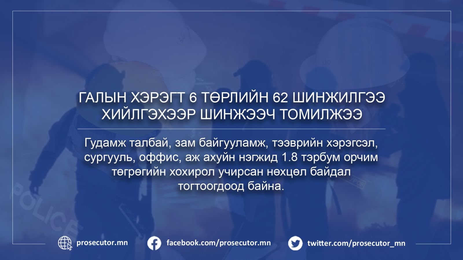 Энэ хүрээнд 250 гаруй хүнээс мэдүүлэг авч, 6 төрлийн 62 шинжилгээ хийлгэхээр шинжээч томилж 58 дүгнэлтийг гаргуулан, зарим эд зүйл, хөрөнгийн үнэлгээг тогтоожээ.