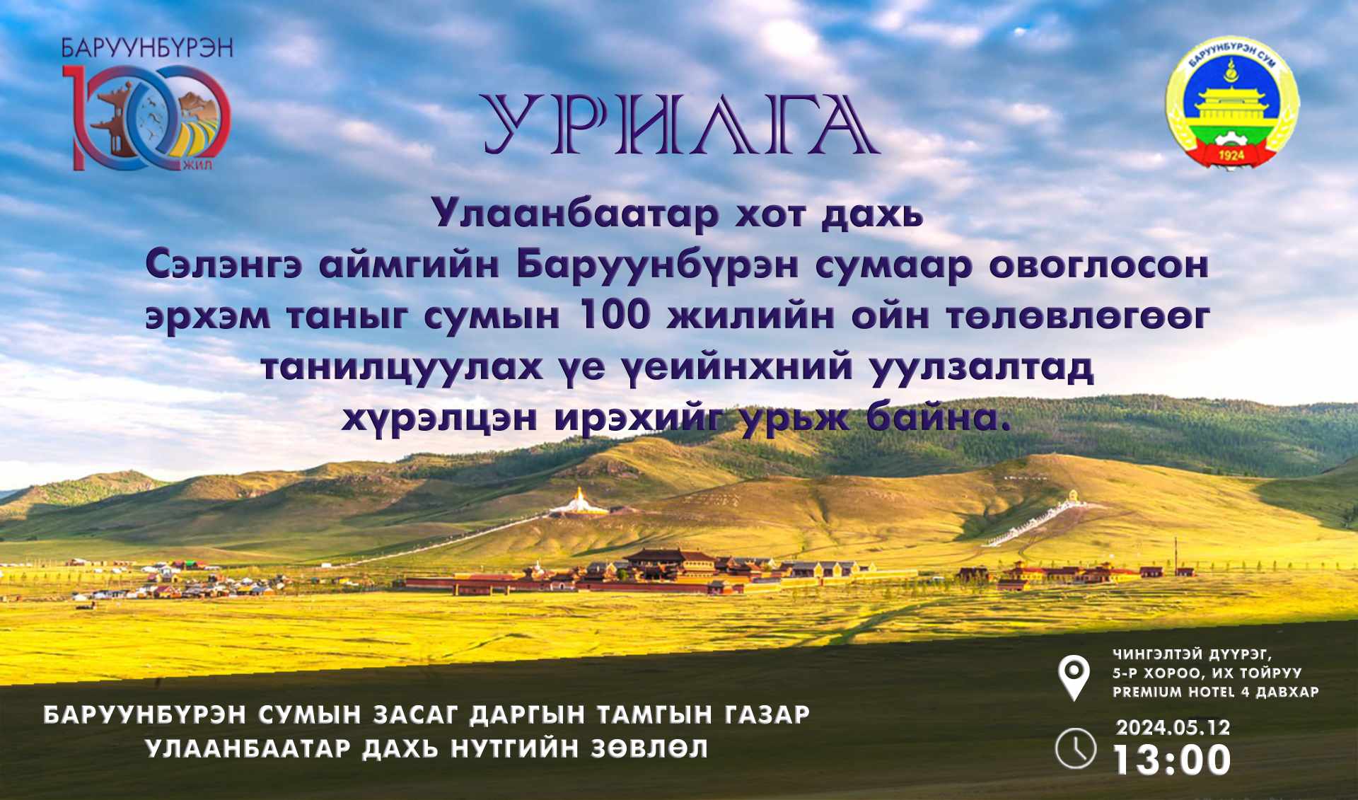 Сэлэнгэ аймгийн Баруунбүрэн сумын 100 жилийн ойг тохиолдуулан тус сумаар овоглосон үе үеийнхний уулзалт энэ сарын 12-нд Улаанбаатар хотод болно.
