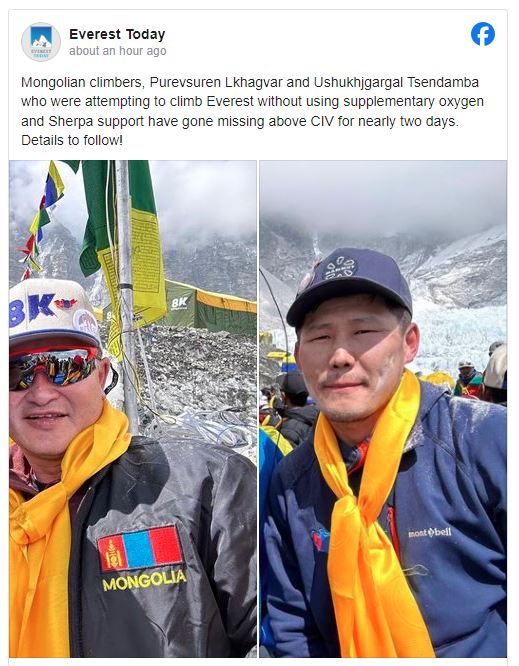 Эверестийн оргилд хөтөчгүйгээр авирсан Монголын хоёр уулчин сураггүй алга болсон талаар “Everest Today” зарлалаа.