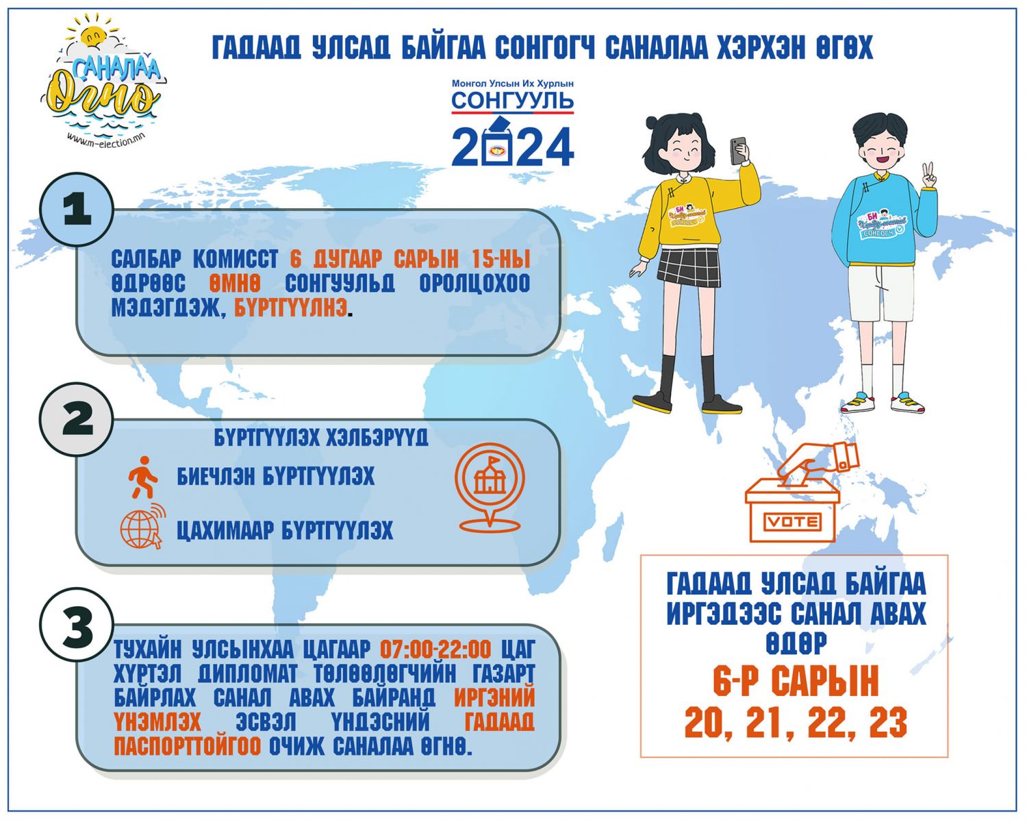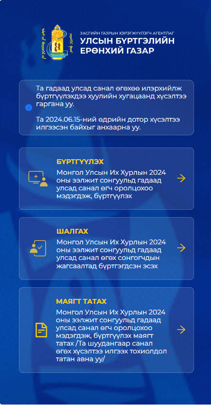 Гадаад улсад байгаа сонгогч Дипломат төлөөлөгчийн газарт биечлэн очиж бүртгүүлэх боломжгүй бол https://election.burtgel.gov.mn/request хаягаар нэвтэрч цахимаар бүртгүүлээрэй.