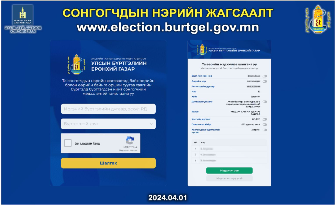 Монгол Улсын Их Хурлын сонгуулийн тухай хуулийн 20 дугаар зүйлийн 20.4 дэх хэсэгт “Улсын бүртгэлийн асуудал эрхэлсэн төрийн захиргааны байгууллага сонгогчдын нэрийн жагсаалтад байгаа сонгуулийн эрх бүхий иргэний эцэг /эх/-ийн болон өөрийн нэр, нас, хүйс, иргэний бүртгэлийн дугаар, байнга оршин суугаа газрын хаягийн бүртгэлийн мэдээллийг аймаг, сум, баг, нийслэл, дүүрэг, хороогоор болон хэсэг нэг бүрээр нэгтгэн гаргах бөгөөд уг жагсаалтыг ээлжит сонгуулийн жилийн 04 дүгээр сарын 01-ний өдрөөс эхэлж, сонгууль дуустал өөрийн цахим хуудсанд байршуулна" хэмээн заасан байдаг.