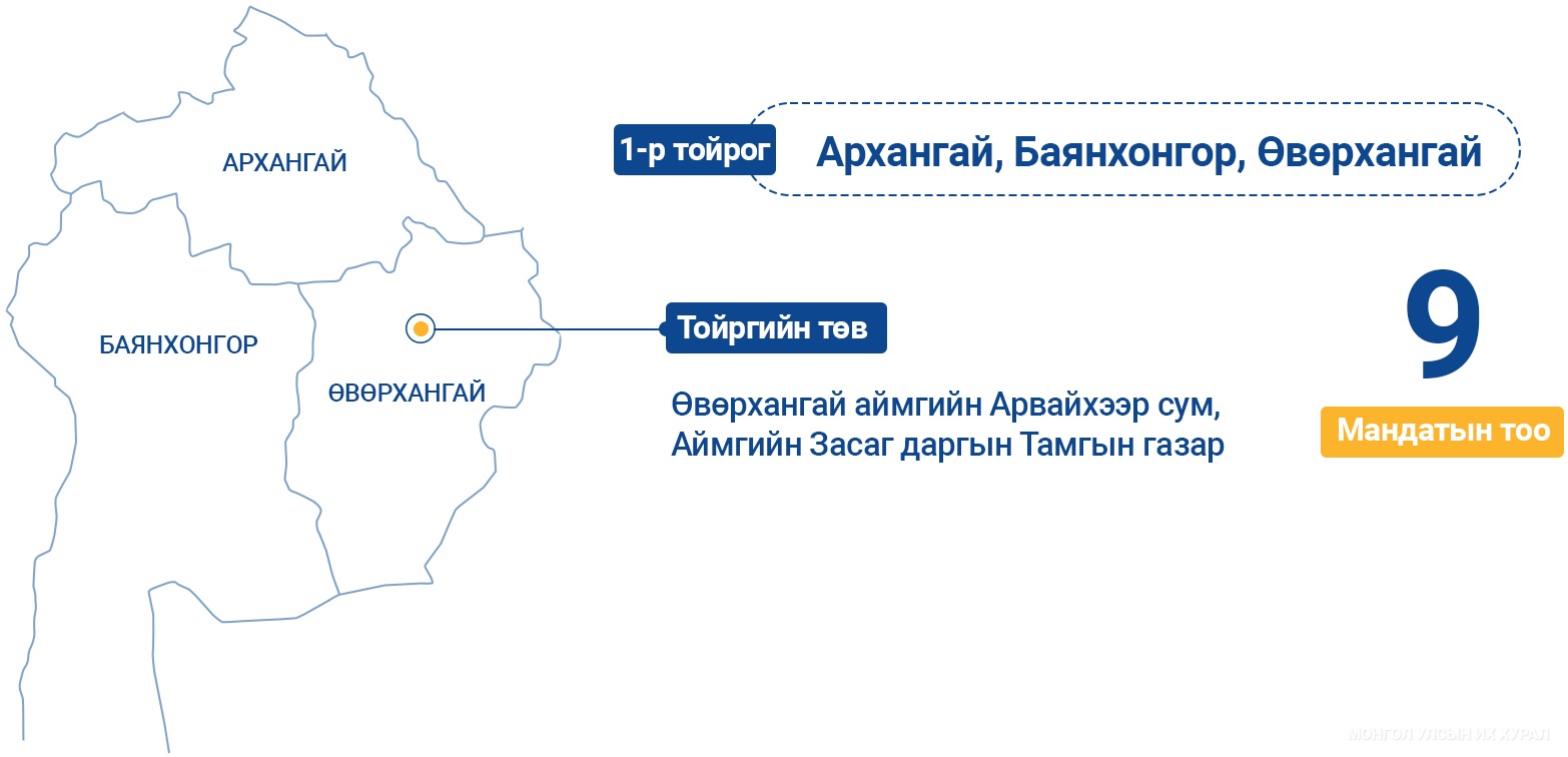Монгол Улсын Үндсэн хуулийн Хоёрдугаар зүйлийн 1 дэх хэсэг, Монгол Улсын Их Хурлын сонгуулийн тухай хуулийн 12 дугаар зүйлийн 12.1, 12.3, 12.4, 12.5 дахь хэсэг, 14 дүгээр зүйлийн 14.17 дахь хэсэг, Монгол Улсын Их Хурлын тухай хуулийн 5 дугаар зүйлийн 5.1 дэх хэсэг, Монгол Улсын Их Хурлын 2001 оны 57 дугаар тогтоолыг үндэслэн Монгол Улсын аймгийг долоон, нийслэлийг зургаан тойрог болгож, Улсын Их Хурлын сонгуулийн нийт 13 тойрог байгуулахаар тогтоов.
