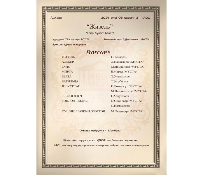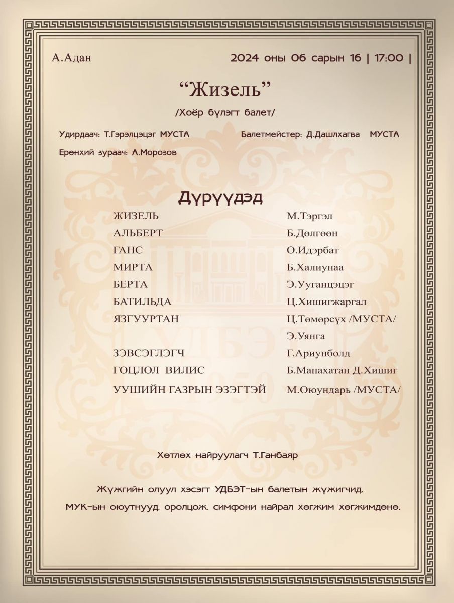 А.Адан ”Жизель” балет 2024 оны 06-р сарын 15, 16-ны өдрийн 17 цагт театрын тайзнаа тоглогдоно. "Жизель” хэмээх эмэгтэйн нэрээр нэрлэгдсэн уг балет нь эхэндээ “The Willis” буюу “Сүнснүүд” гэсэн нэртэй байсан.