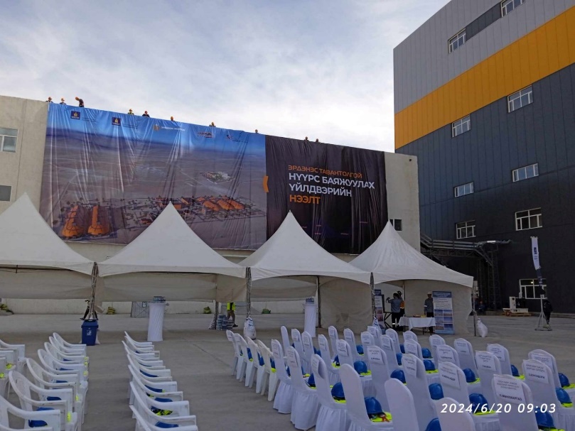 Тусгайлан зассан талбайд хүндэтгэлийн индэр, зочдын суудал засч, асар майхан босгожээ. Нүүрс баяжуулах үйлдвэрийн хананд нээлтийн ёслолд зориулсан мэндчилгээ бүхий том том хулдаасан сурталчилгаа өлгөөөтэй харагдана. Өглөөний 9 цаг дөнгөж болж байгаа боловч үдийн нар гарсан юм шиг зулай дээрээс халуу шатаж байлаа.