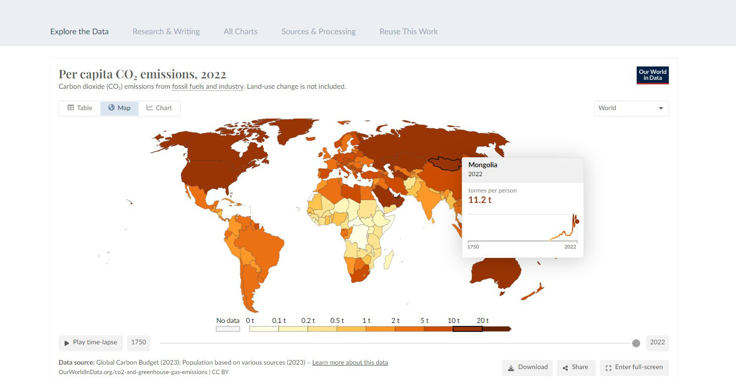 Монгол Улсын хувьд агаарын бохирдол онц аюултай хэмжээнд хүрснийг илтгэх ганц жишээ дурдахад, улс орон бүрийн нэг хүнд ноогдох CO2-ын хэмжээг харуулсан газрын зурагт 2022 оны үзүүлэлтээр Монгол Улсын нэг хүнд ноогдох нүүрстөрөгчийн давхар исэл CO2-ын хэмжээ 11,2 тн байгаа нь түгшүүрийн харанга дэлдэж буй явдал юм?!