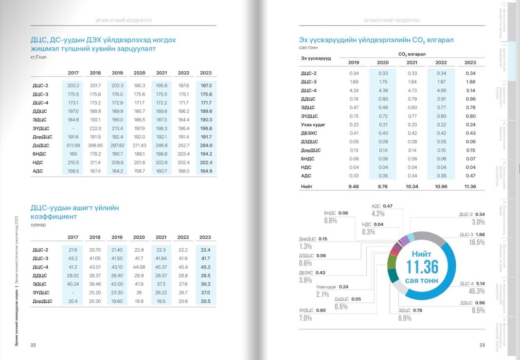 Дотоодын эрчим хүч үйлдвэрлэлийн 90.9 хувийг эзэлдэг дулааны цахилгаан станцын үйл ажиллагааны үр дүнд 11.36 сая тонн нүүрстөрөгчийн давхар исэл CO2 ялгардаг бөгөөд энэ хэмжээ жилээс жилд нэмэгдсээр ирснийг хүснэгтээс харж болно. Мөн эрчим хүч үйлдвэрлэгч тус бүрийн нүүрстөрөгчийн давхар исэл CO2 ялгаруулалтад эзлэх хувийг графикт үзүүлэв. (Эх сурвалж: ЭХЗХ, Эрчим хүчний статистик үзүүлэлтүүд-2023)