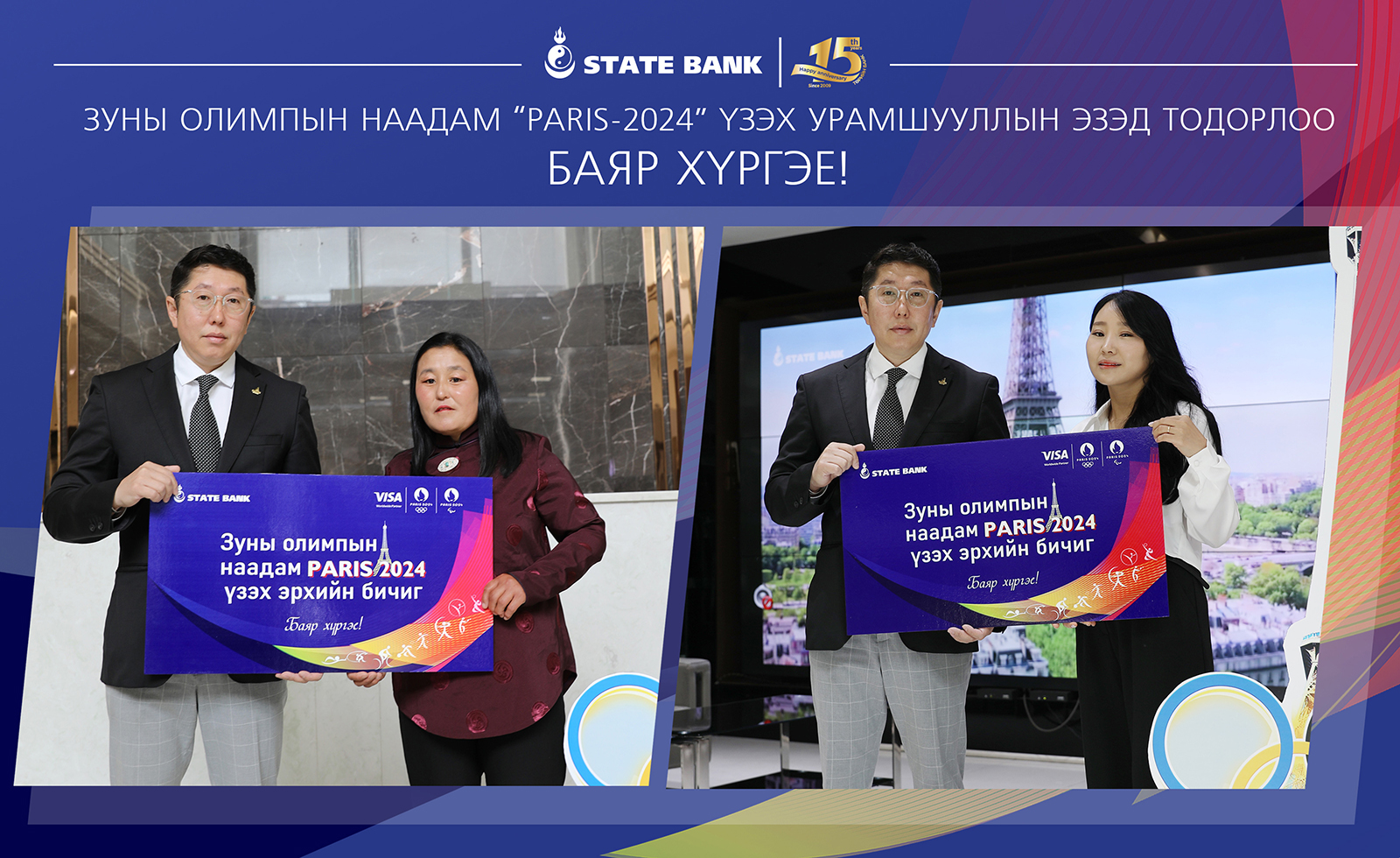 Тэгвэл өнөөдөр тус аяны азтанаар тодорч, Парис 2024 зуны олимпын наадмыг үзэж, Парис хотоор аялах хоёр харилцагч Төрийн банкны төв байран дээр хүрэлцэн ирж эрхийн бичгээ гардан авлаа.
