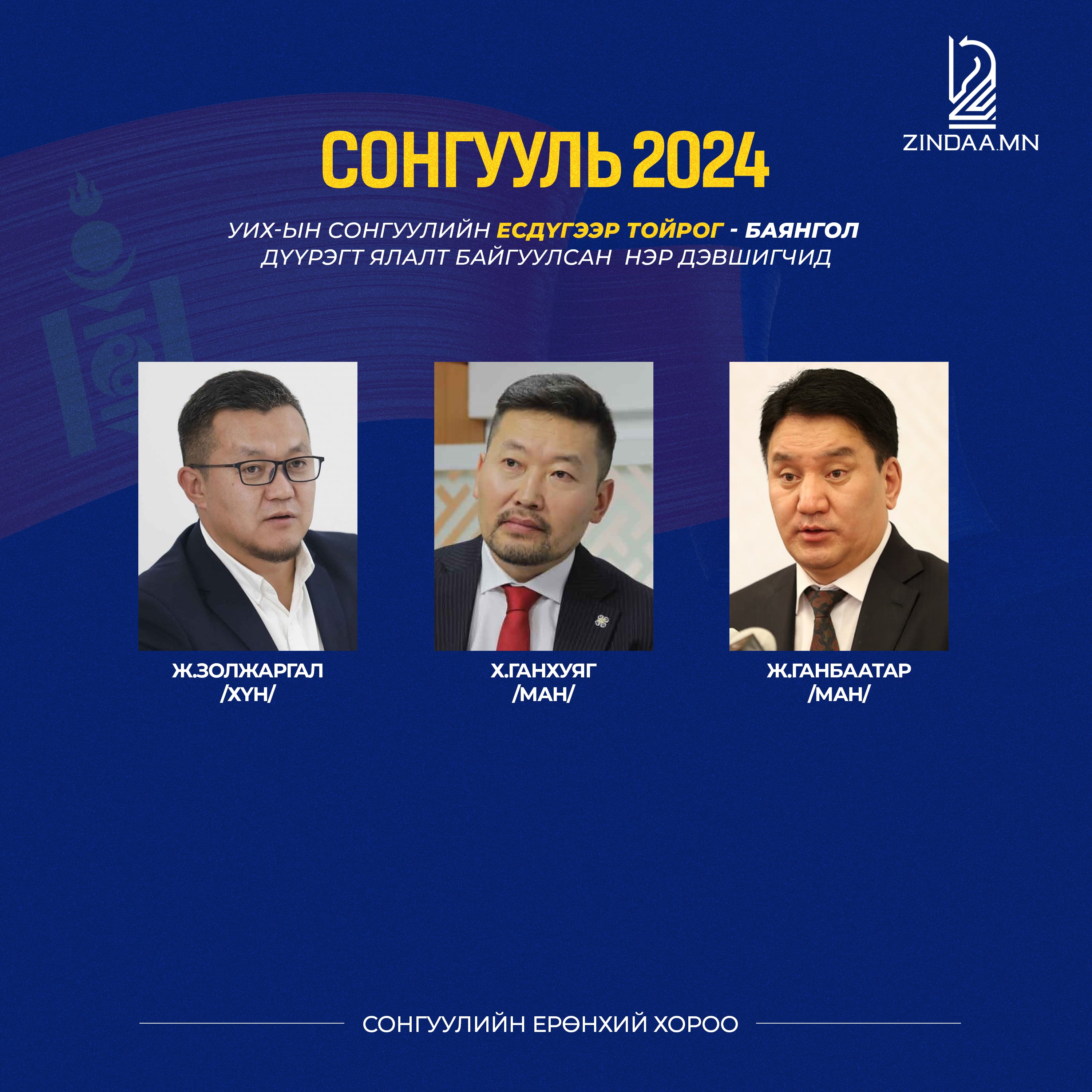 Сонгуулийн урьдчилсан дүн мэдээгээр УИХ-ын сонгуулийн есдүгээр тойрог буюу Баянгол дүүрэгт МАН-аас нэр дэвшигч Жамбалын Ганбаатар, Хассуурийн Ганхуяг, ХҮН- намаас Жаргалсайханы Золжаргал нар хамгийн өндөр санал авлаа.