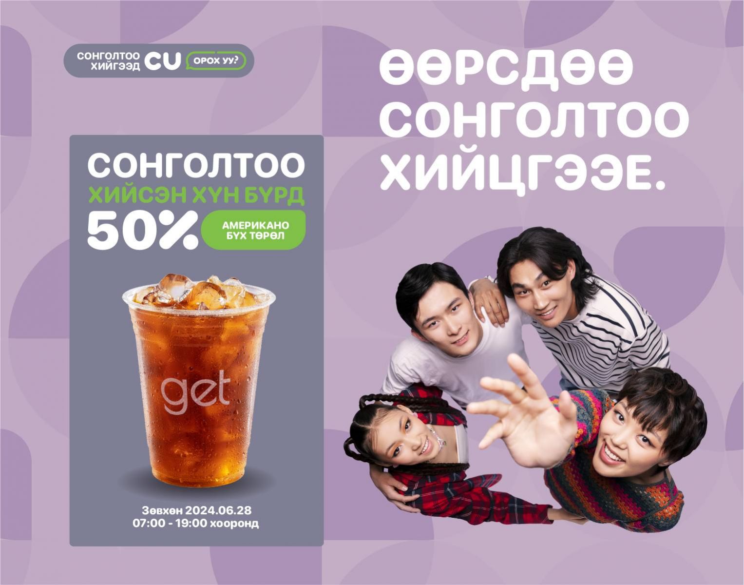 Сонгох эрхээ эдлээд сонголтоо хийсэн хүн бүрд CU бүх төрлийн Americano 50% хямдралтай худалдаалж байна. CU-н бүх салбараар үйлчлүүлээрэй.