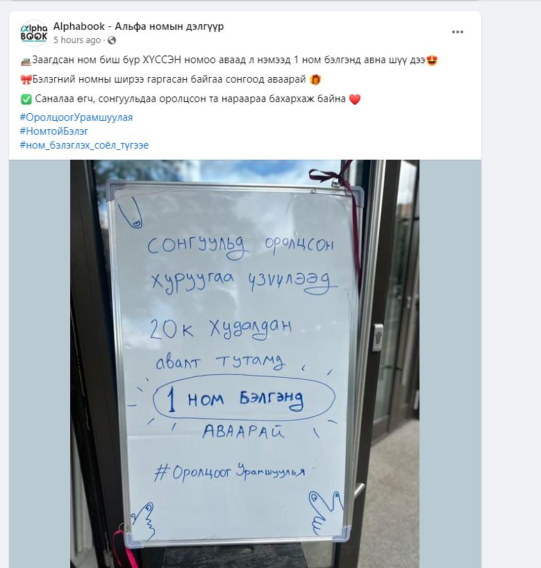 Альфа номын дэлгүүр хүссэн номоо аваад нэмээд нэг ном бэлгэнд авах боломжтой. Мөн орон нутагт оршин суугаа иргэд болон ирэх боломжгүй байгаа уншигчид санал өгсөн хуруугаа оруулж селфи хийгээд чатаар илгээн хүссэн номоо авч, нэг ном бэлгэнд авах урамшуулалд хамрагдах боломжтой.