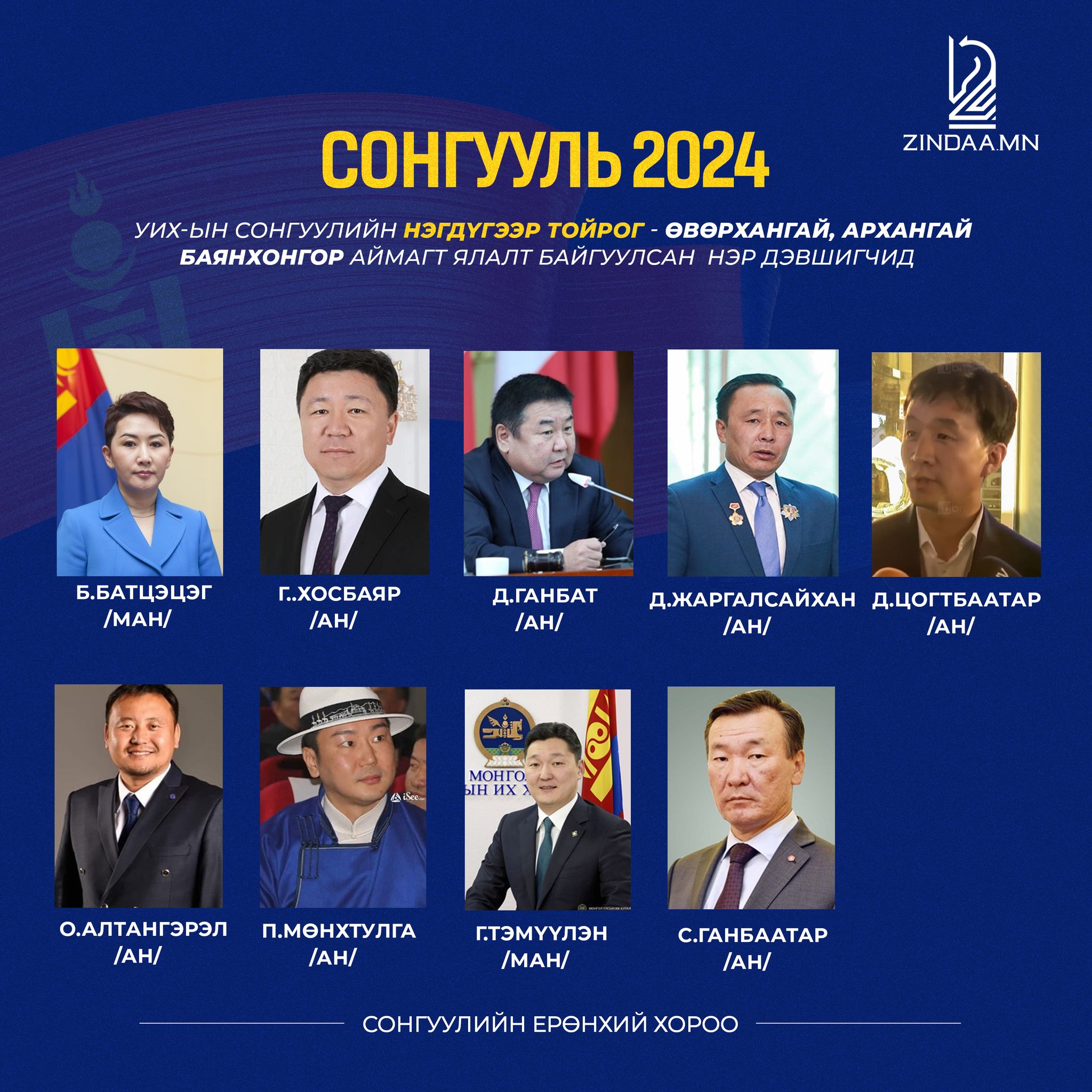 Сонгуулийн урьдчилсан дүн мэдээгээр УИХ-ын сонгуулийн нэгдүгээр тойрог буюу Өвөрхангай, Архангай, Баянхонгор аймагт дараах нэр дэвшигчид хамгийн өндөр санал аваад байна.