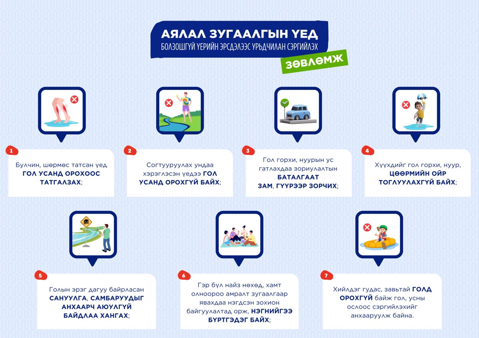 - Голын эрэг дагуу байрласан сануулга, самбаруудыг анхаарч аюулгүй байдлаа хангах;
