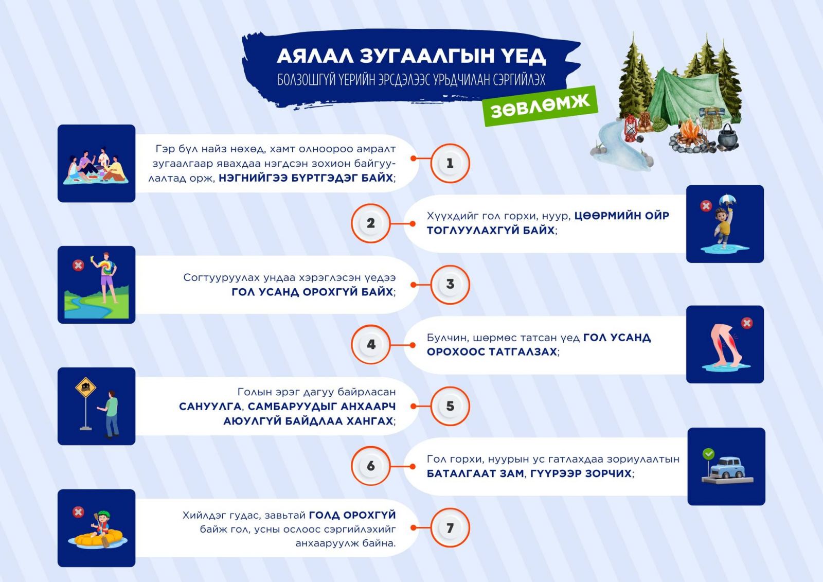 - Голын эрэг дагуу байрласан сануулга, самбаруудыг анхаарч аюулгүй байдлаа хангах;