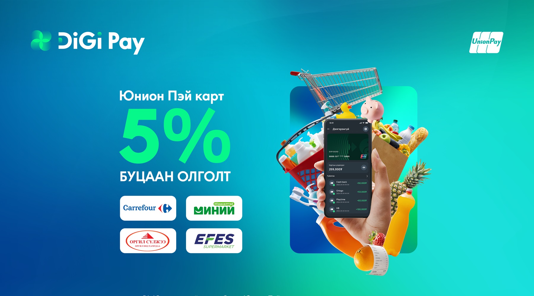 Үндэсний их баяр наадам тохиож буй 7-р сарыг дуустал ХААН Банкны Digi Pay аппликэйшний хэрэглэгч эрхэм харилцагч та бүхэн аппликэйшндээ холбосон юнион пэй картаараа “Миний дэлгүүр”, “Carrefour”, “Оргил”, “Efes” сүлжээ дэлгүүрүүдээр худалдан авалт хийгээд 5% буцаан олголт авах боломжтой боллоо.