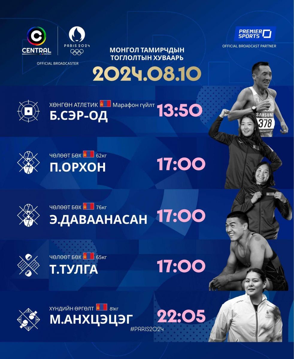 Мөн 14:00 цагаас Монголын тугч, марафонч Бат-Очирын Сэр- Од Парис хотын Отель де Вилийн талбайгаас 42 км 195 метр зайг туулж эхлэх бол шөнийн 22:00 цагаас Мөнхжанцангийн Анхцэцэг хүндийг өргөлтийн төрөлд хүч чадлаа сорин өрсөлдөнө.