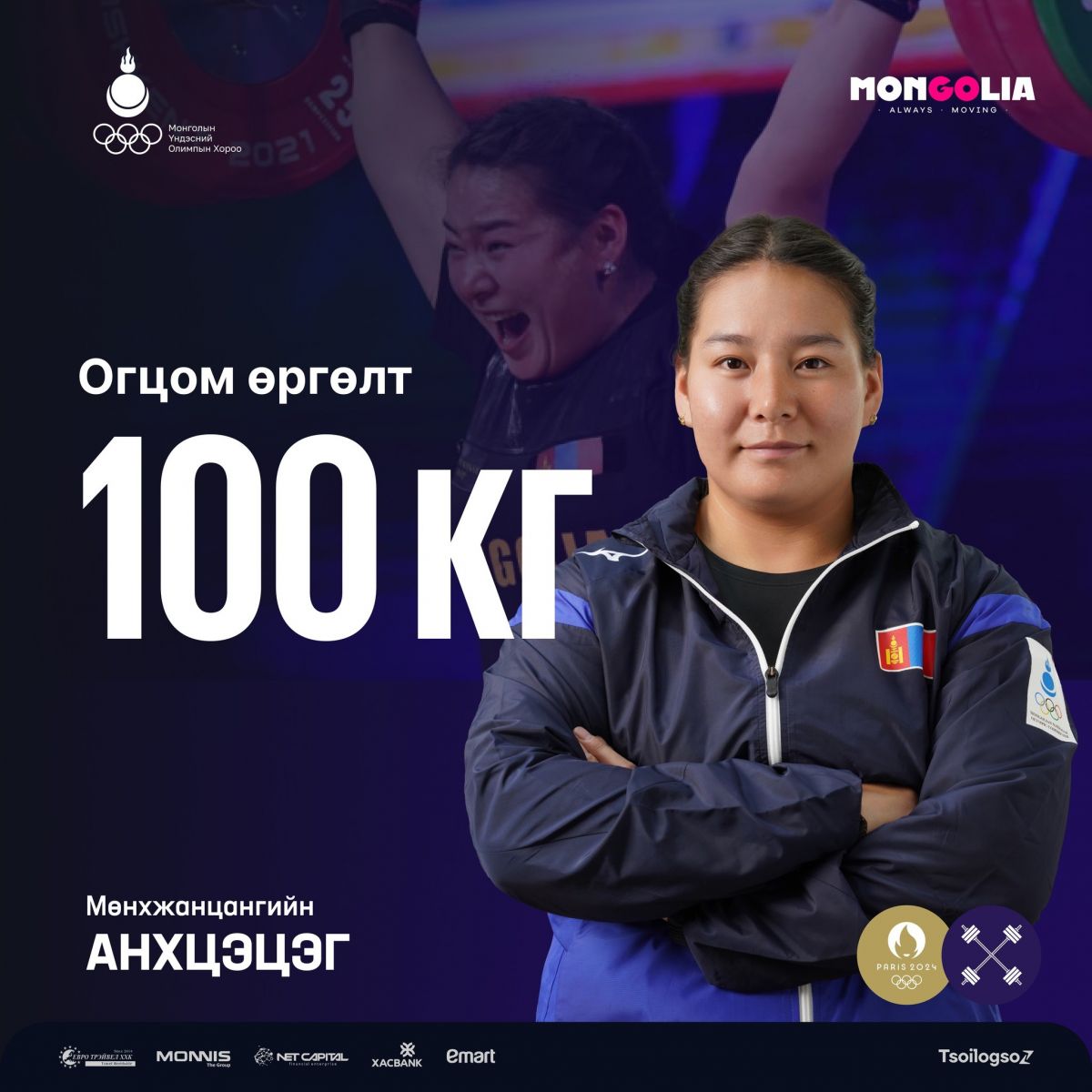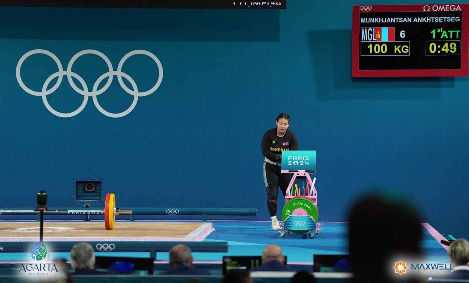 ДАШТ-ий алт, мөнгө, хошой хүрэл медаль, “Токио-2020” олимпын наадмын 4 дүгээр байрын шагналт, Гавьяат тамирчин М.Анхцэцэг Парисын олимпын наадмын хүндийг өргөлтийн 81 кг-ын жинд өрсөлдөж байна.