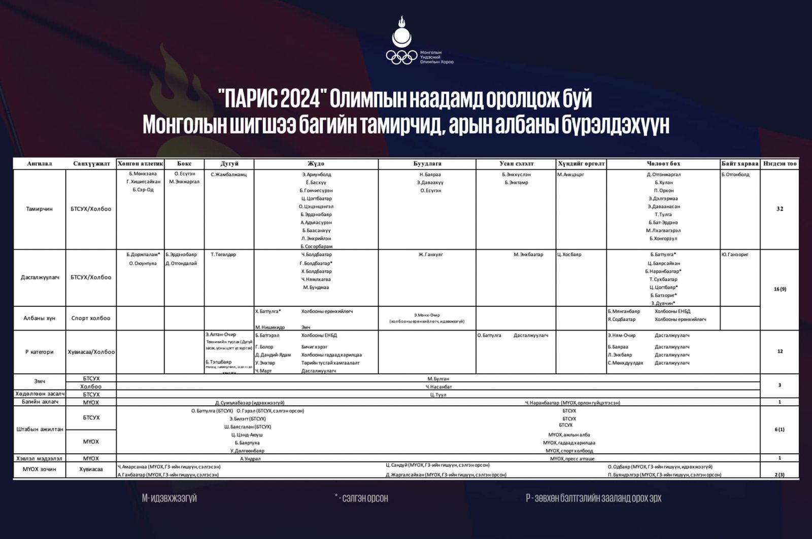 “Парис 2024” Олимпын наадамд оролцсон шигшээ багийн тамирчид, албаны бүрэлдэхүүнд олгогдсон мандатын мэдээллийг нээлттэйгээр танилцуулж байна.