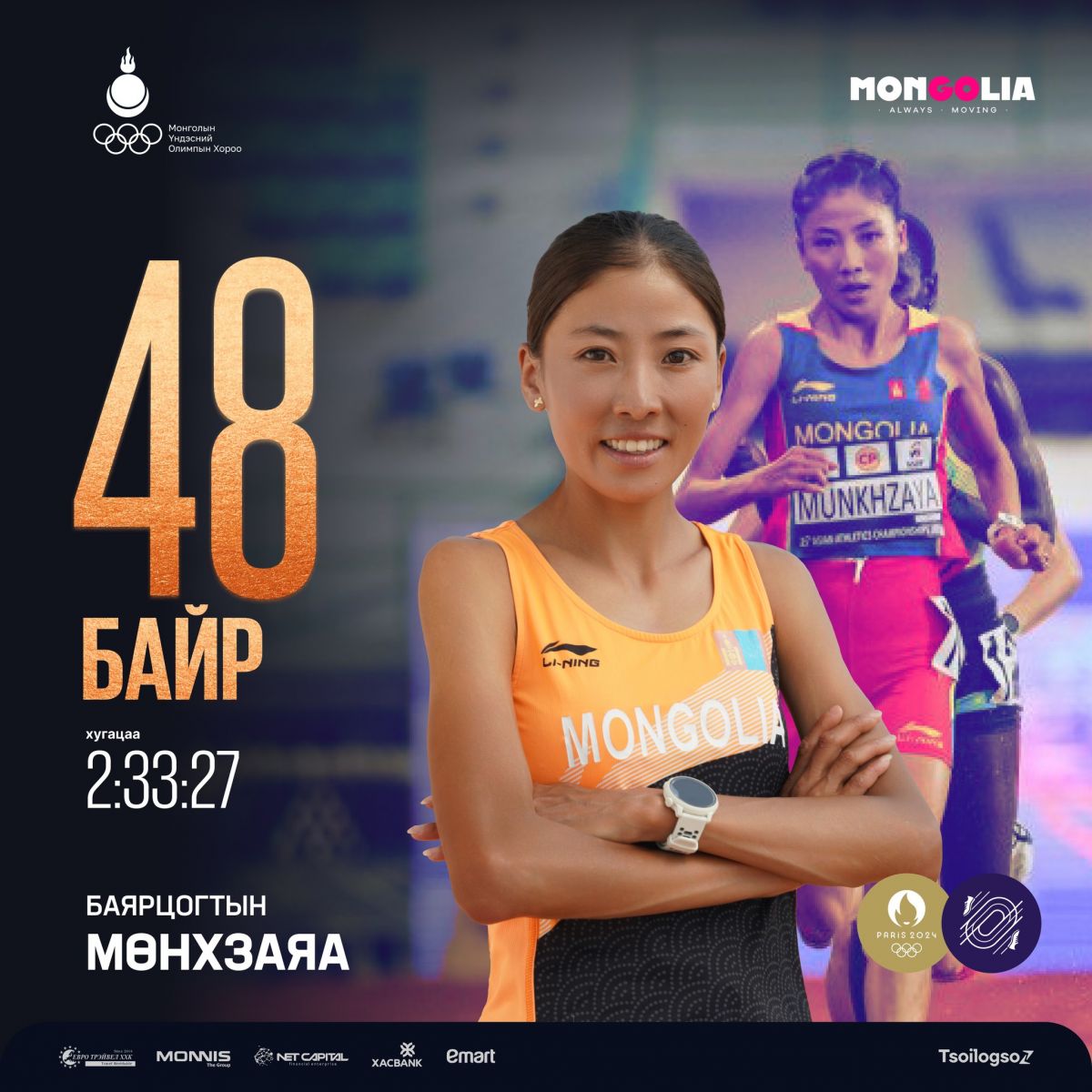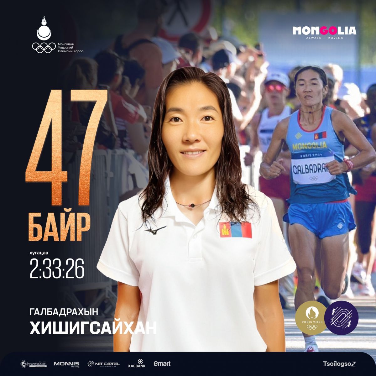 "Парис 2024" зуны XXXIII Олимпын наадмын Хөнгөн атлетик-Марафоны эмэгтэйчүүдийн төрөлд өрсөлдсөн тамирчид маань амжилттай барианд орж ирлээ.